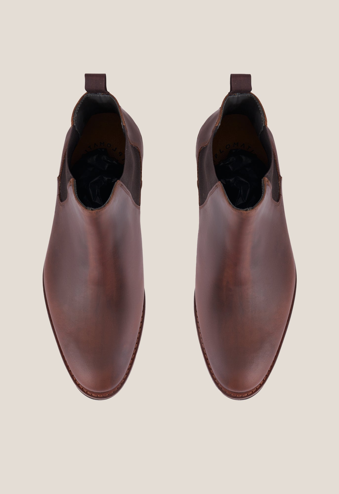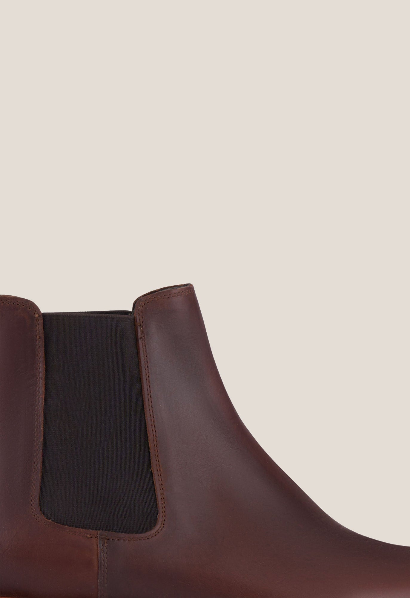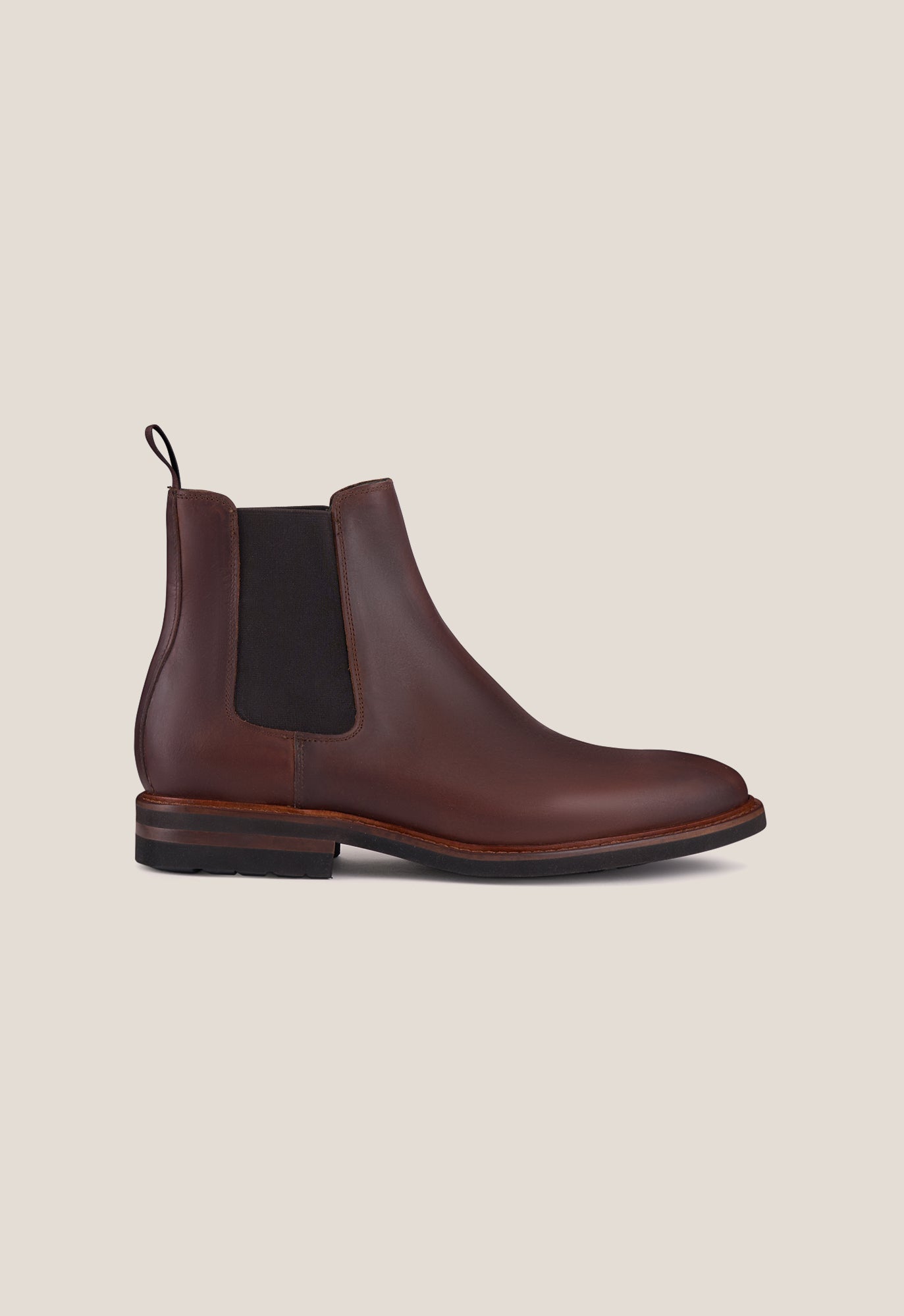 Chelsea boot with elasticated sides and an aesthetic rear pull tab in chestnut-colored waxed leather. Exclusive boot last for better support. True to size.