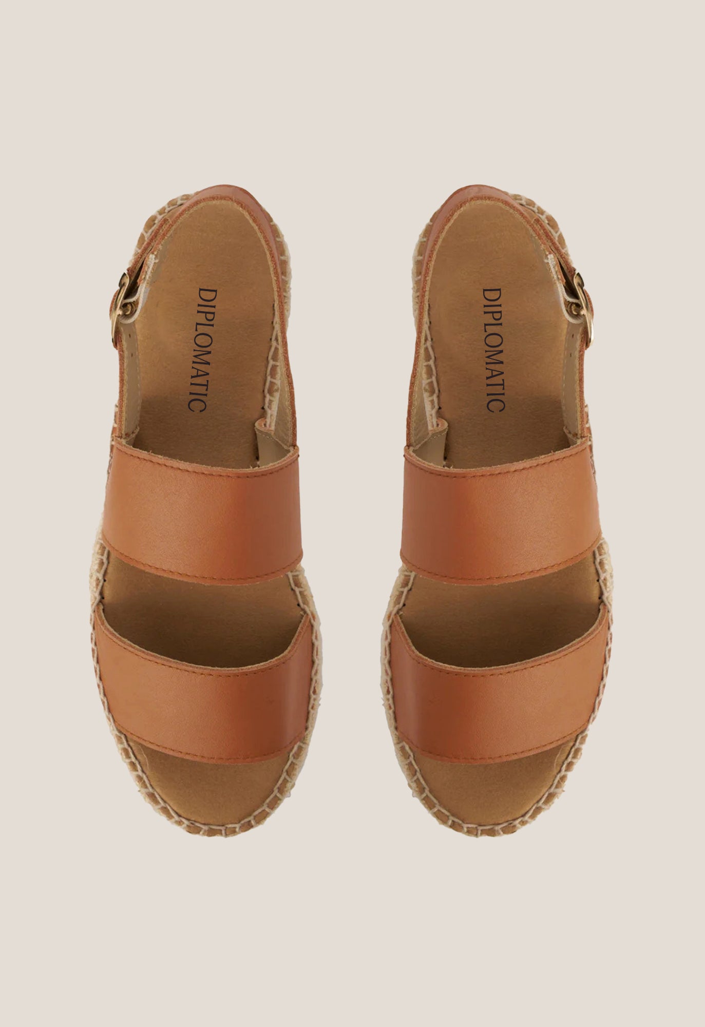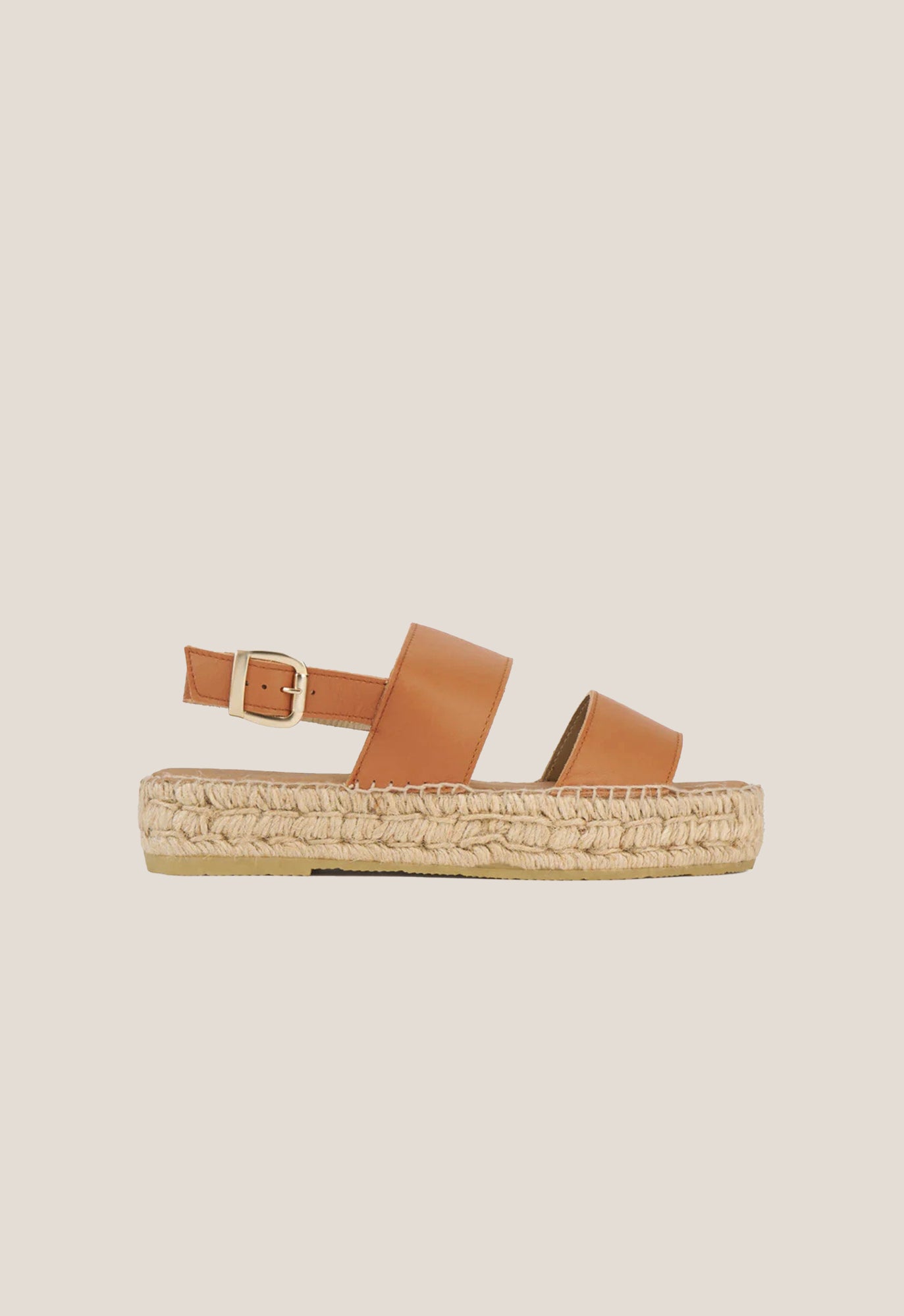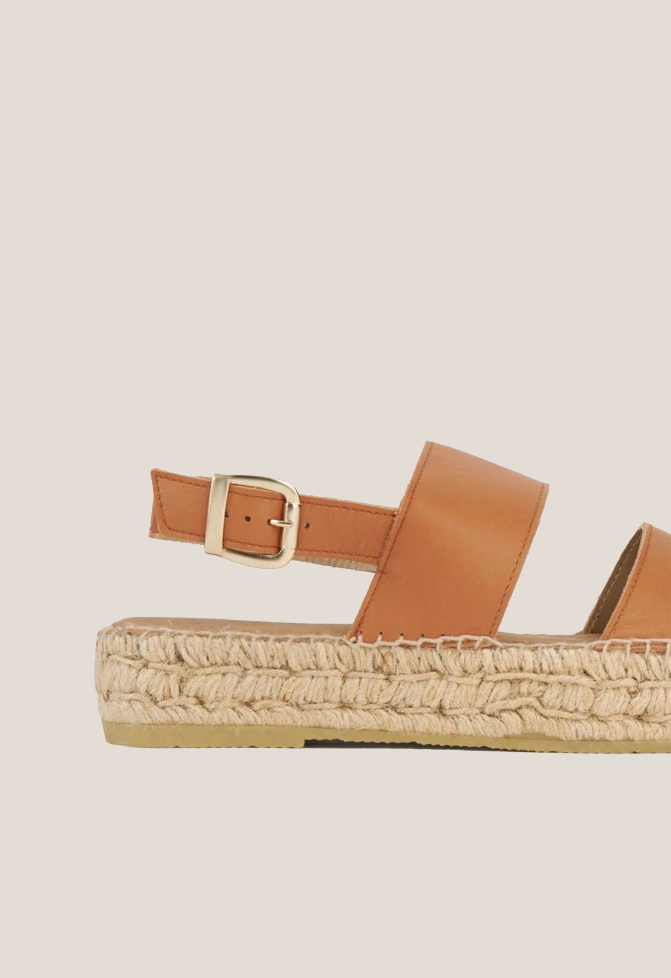 Open espadrille in toffee-colored suede with two straps across the instep and buckle adjustment at the ankle.