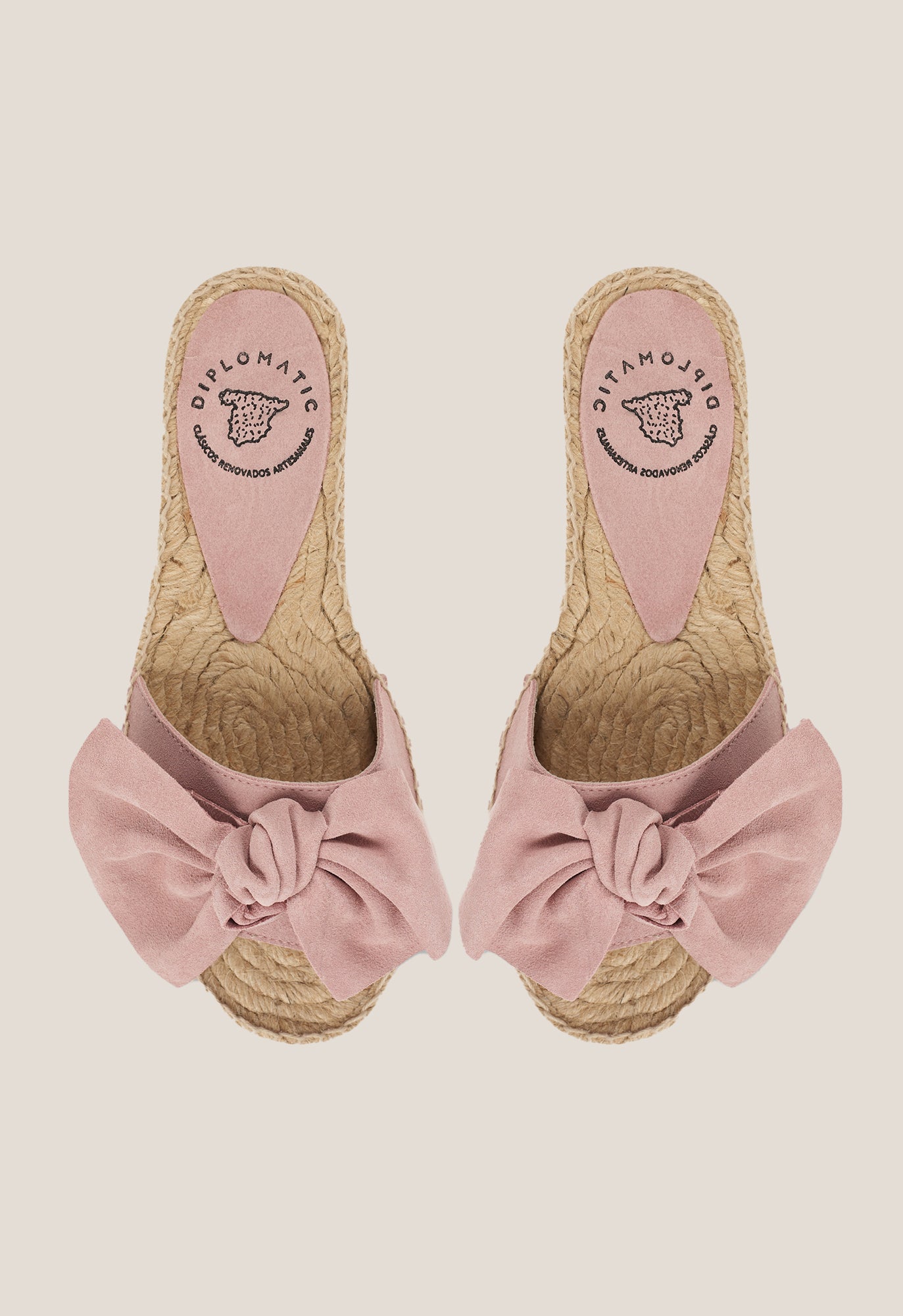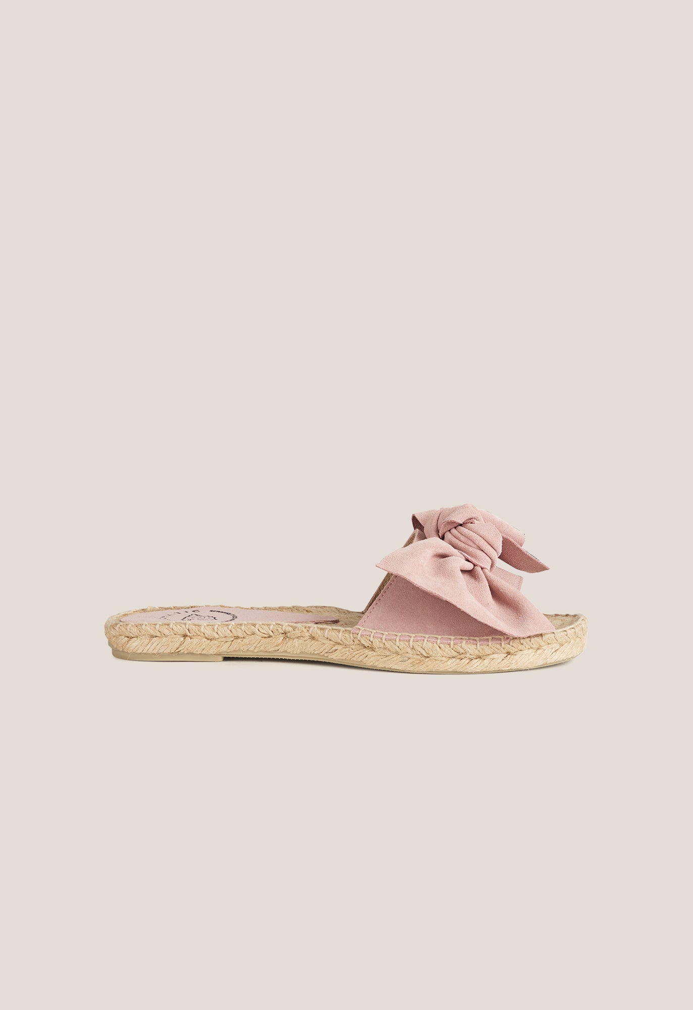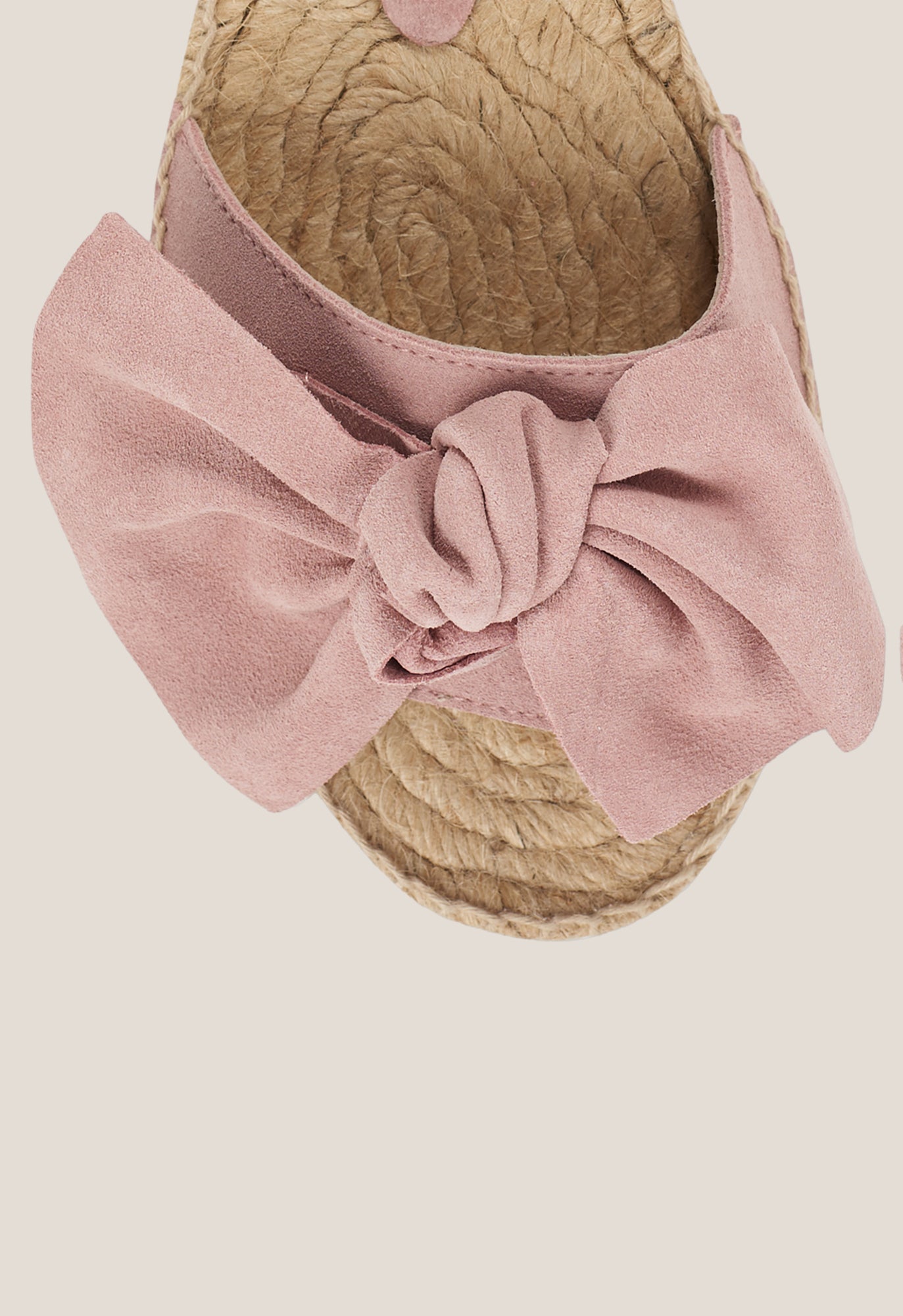 Open espadrille with a pink suede strap on the vamp . Finished with a sole. non-slip rubber .
