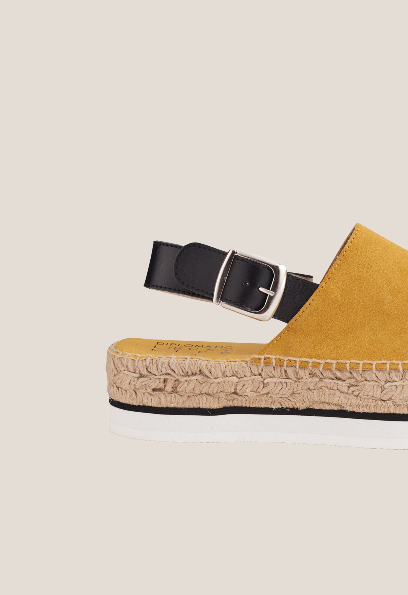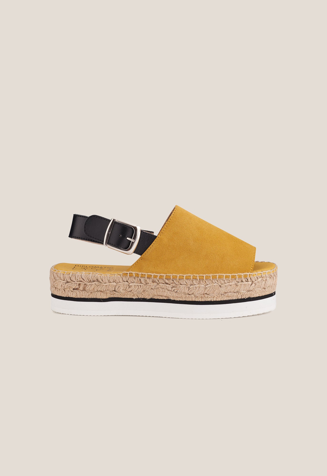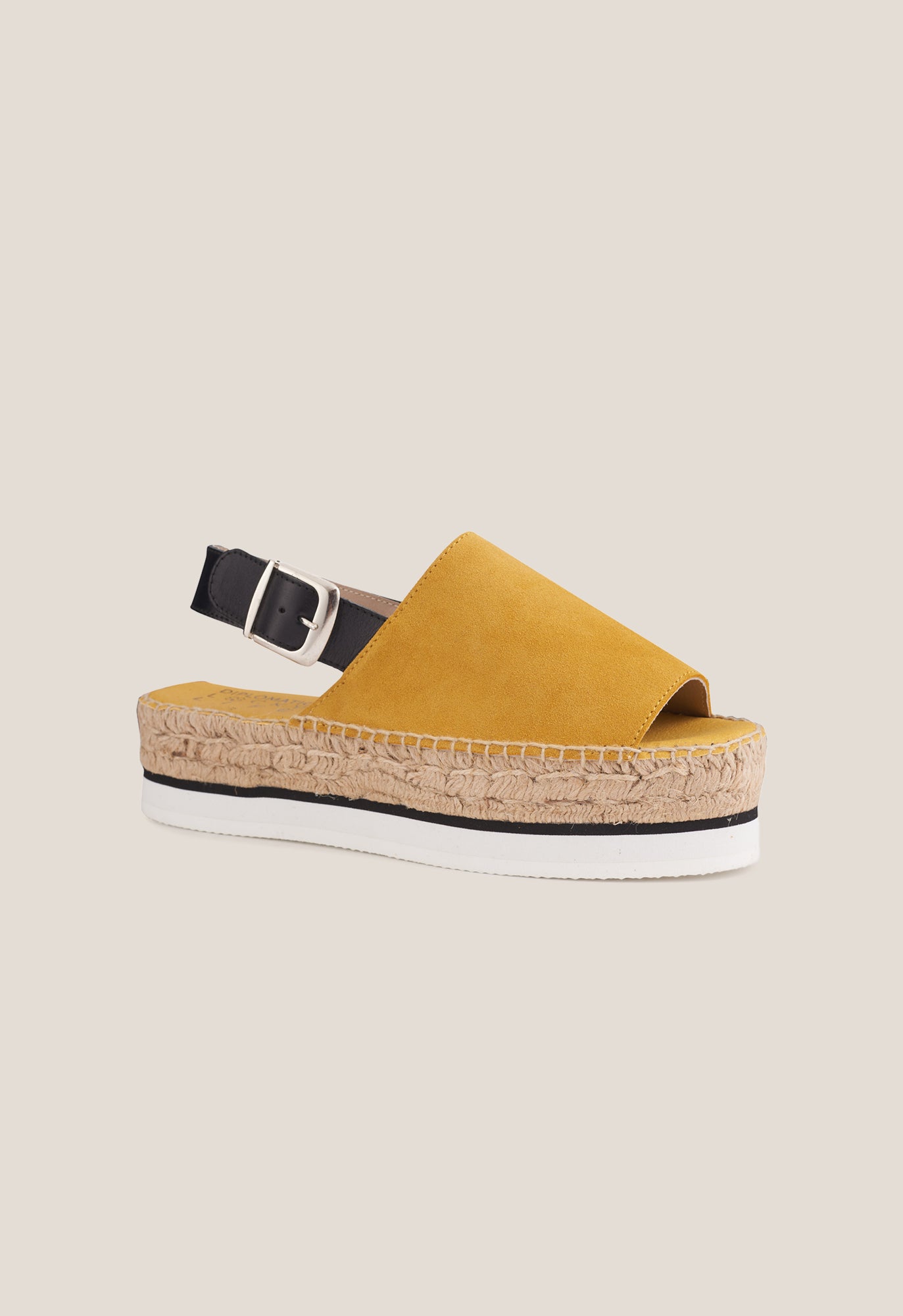 Mustard-colored suede espadrille with buckle adjustment at the ankle.