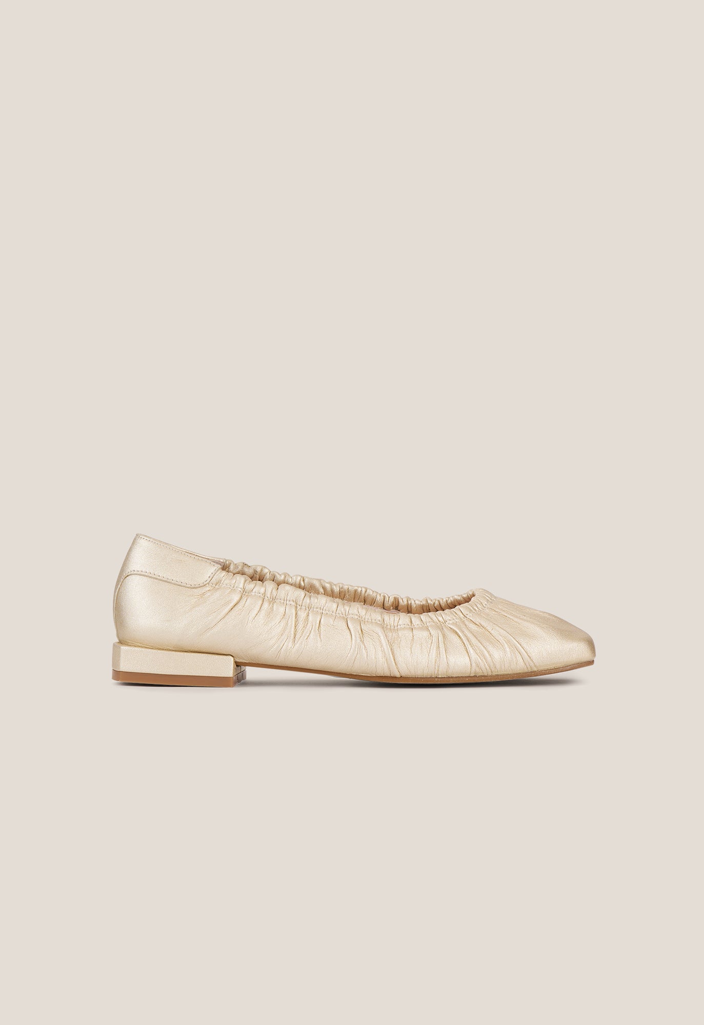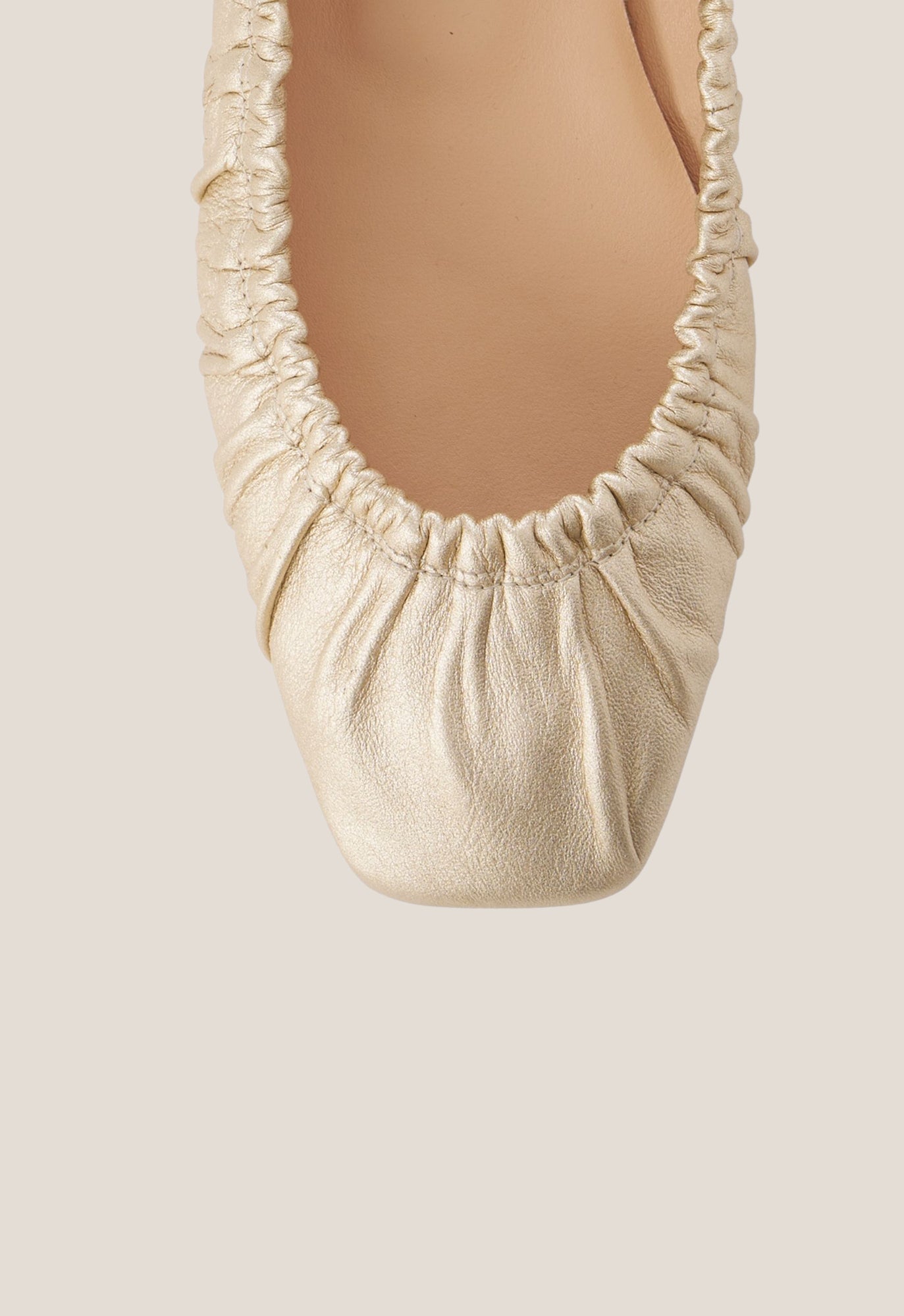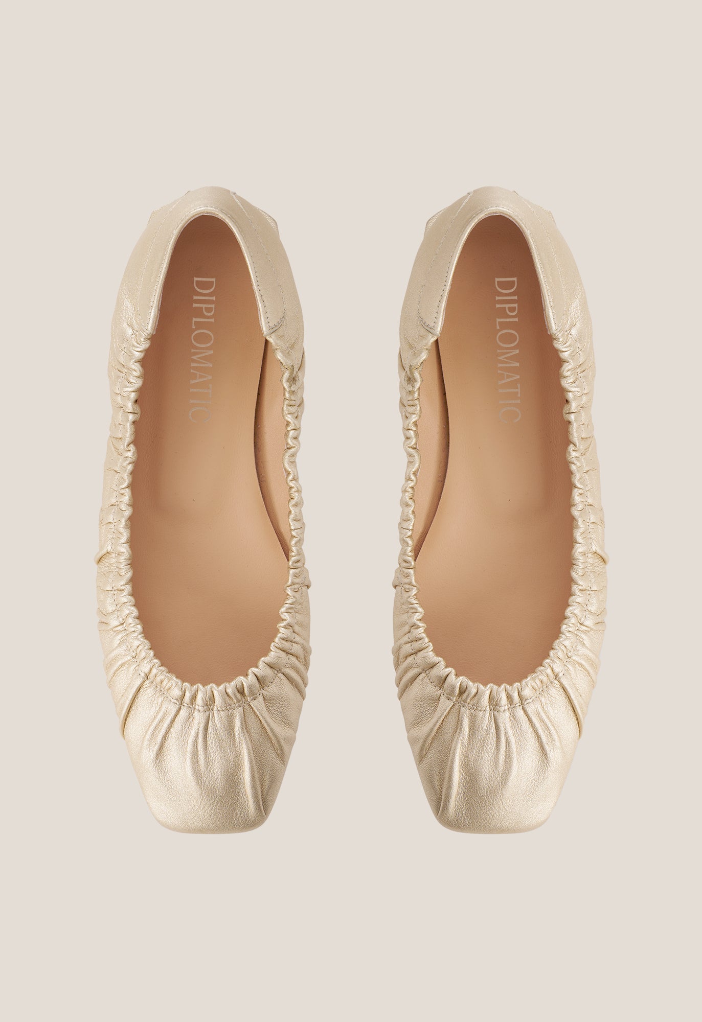 +34915369065Gold calfskin ballerina flat with a gathered detail. Square toe and low heel.