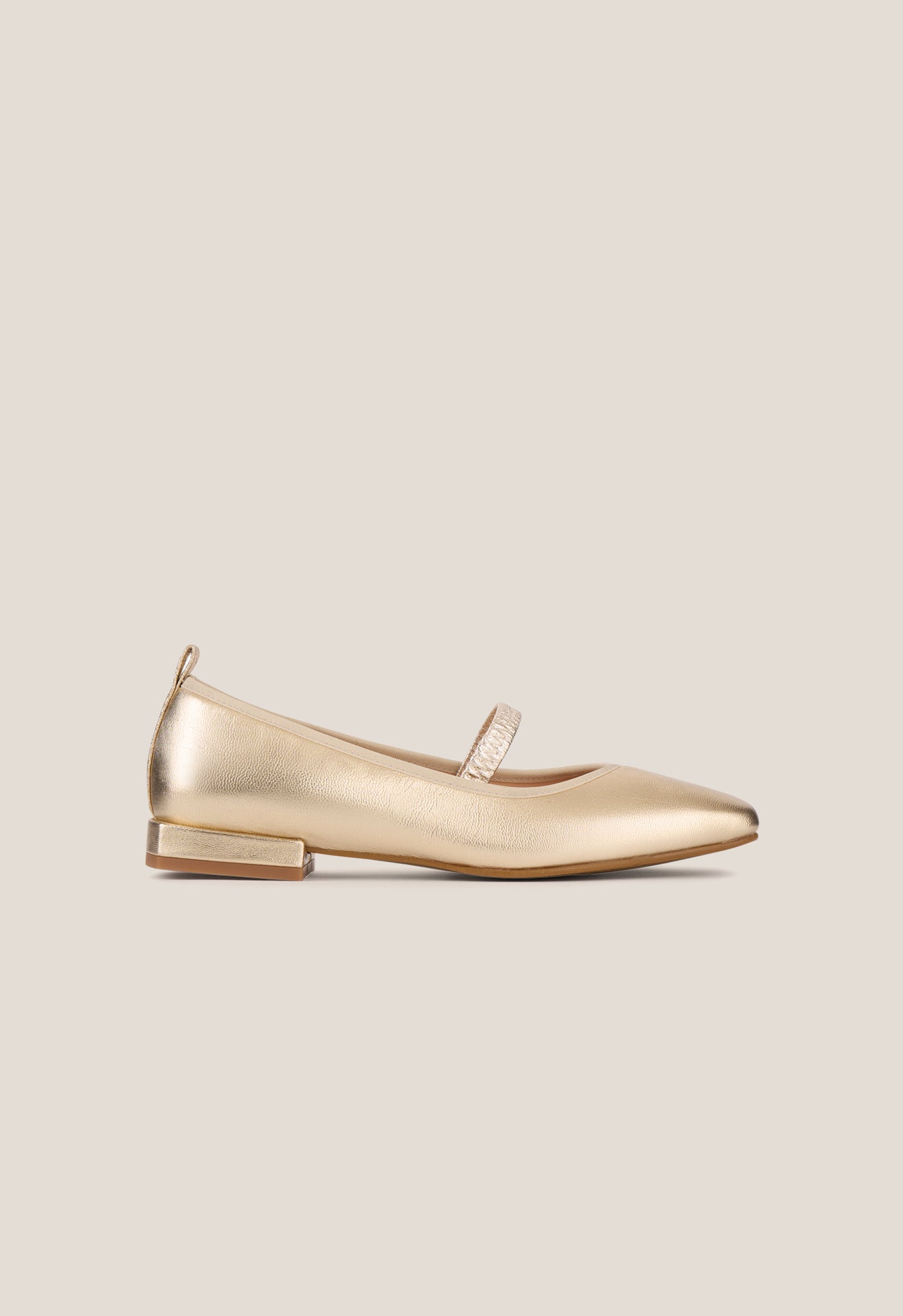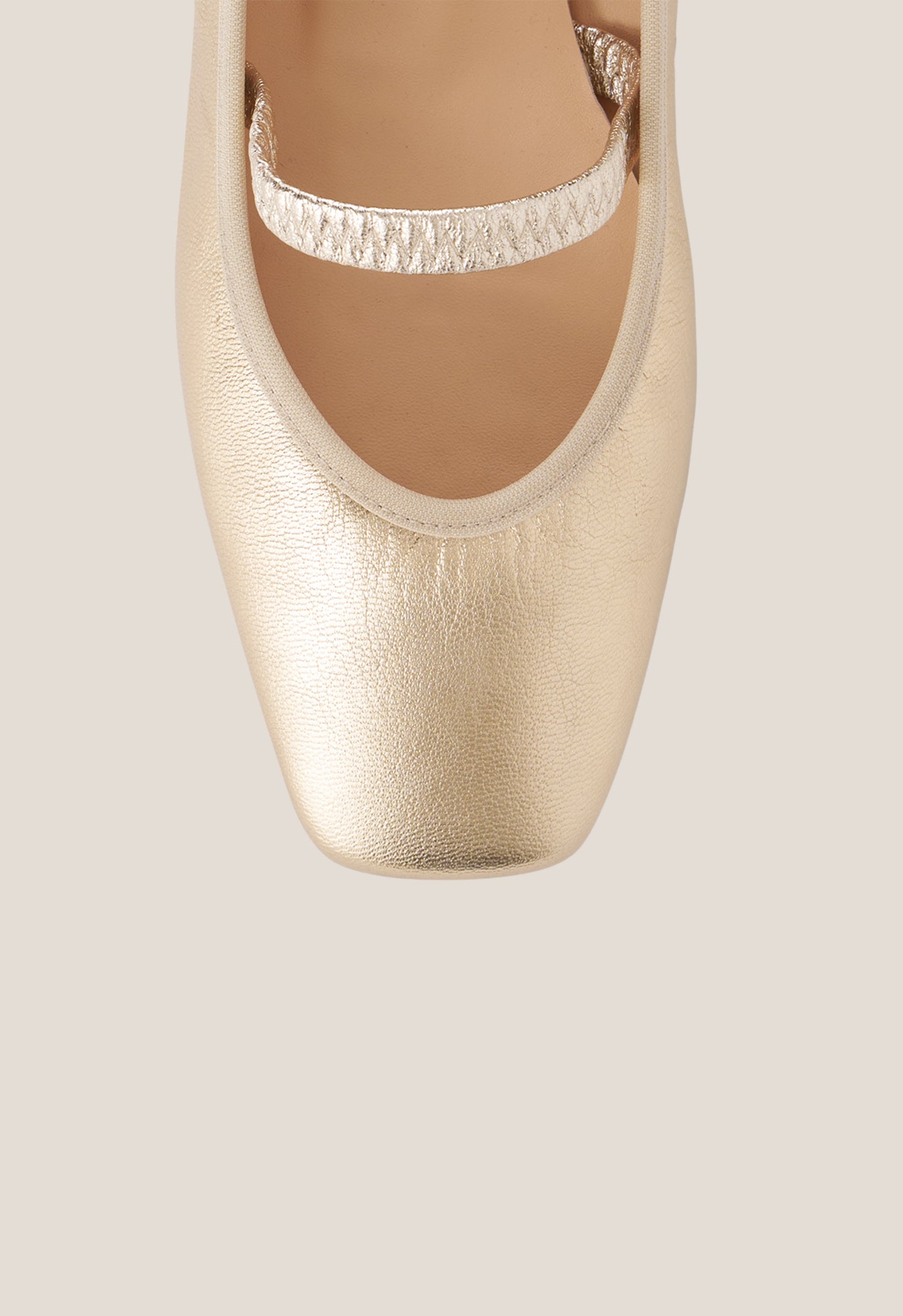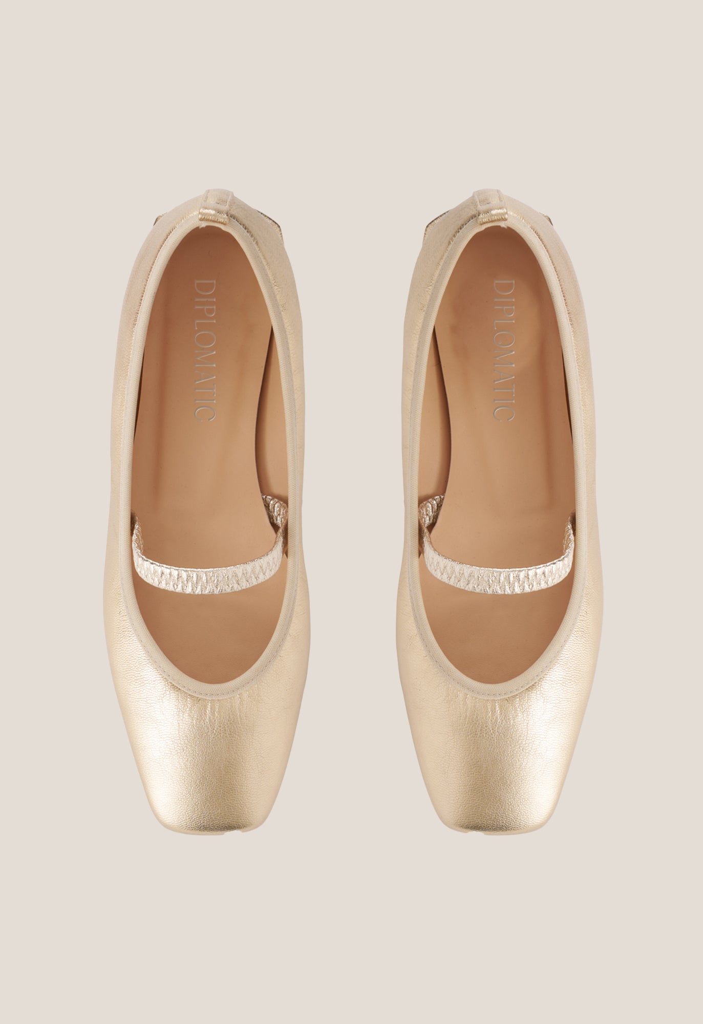 +34915369065 Gold calfskin ballerina flat with elastic strap. Square toe and low heel.
