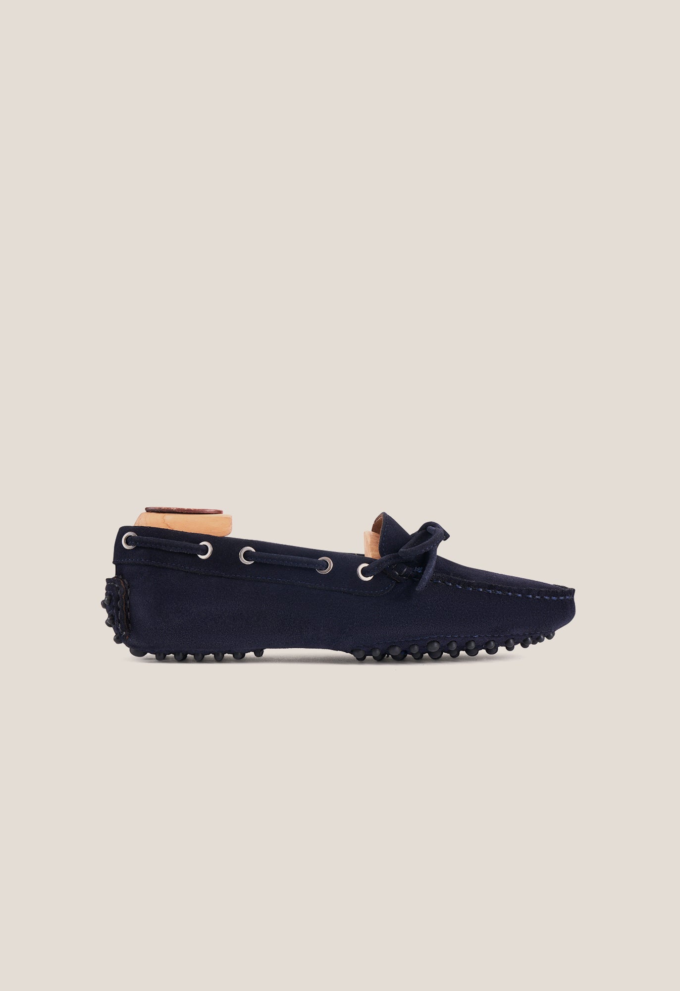 Navy suede bow loafer. Finished with a non-slip rubber multi-lug sole.