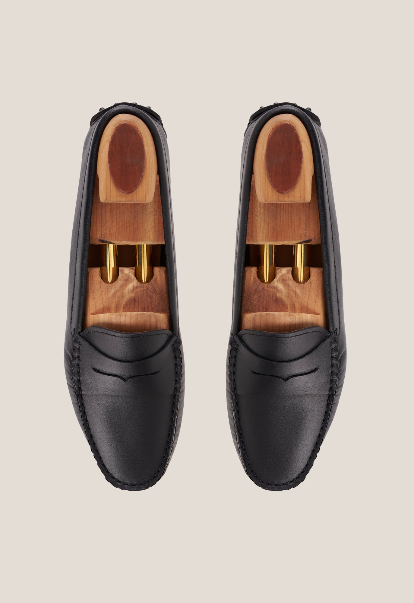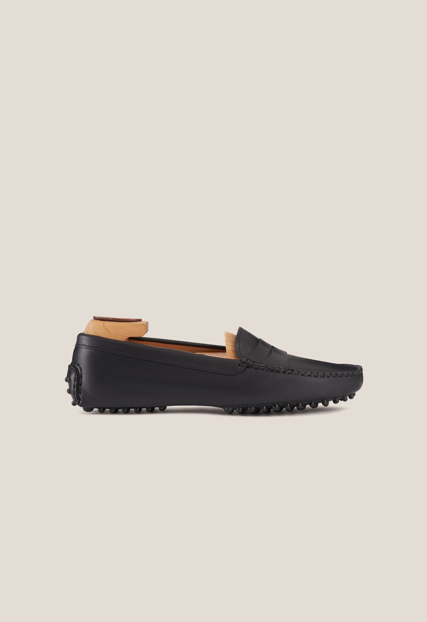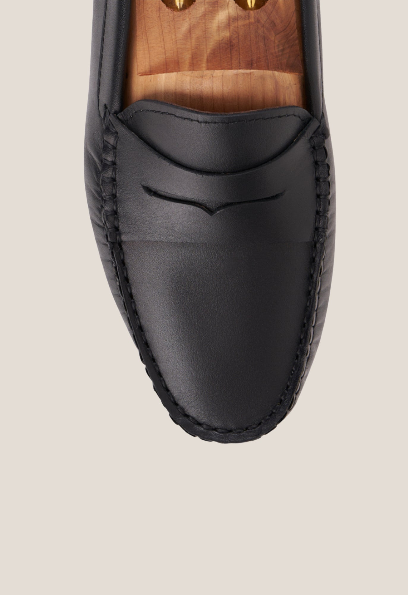Black calfskin masked moccasin. Finished with a non-slip rubber multi-lug sole.