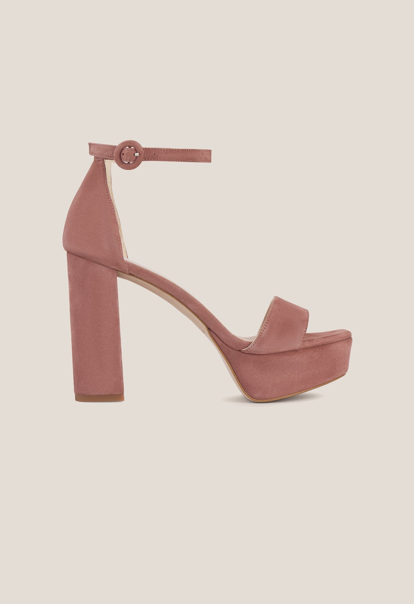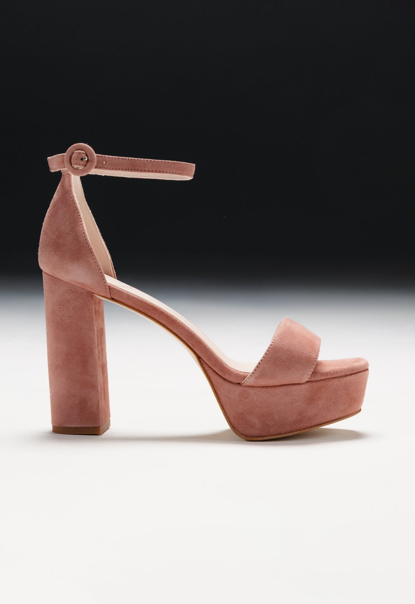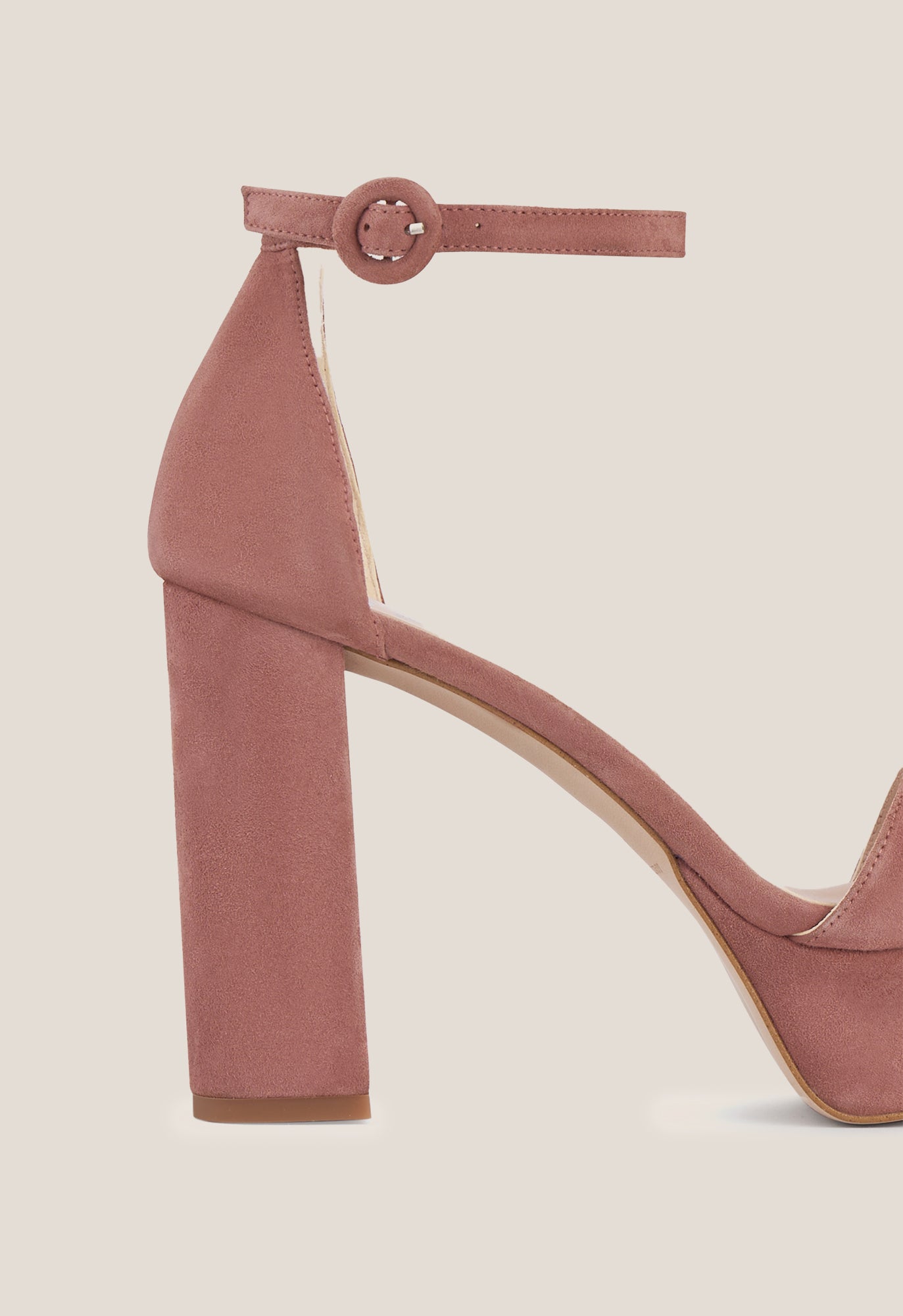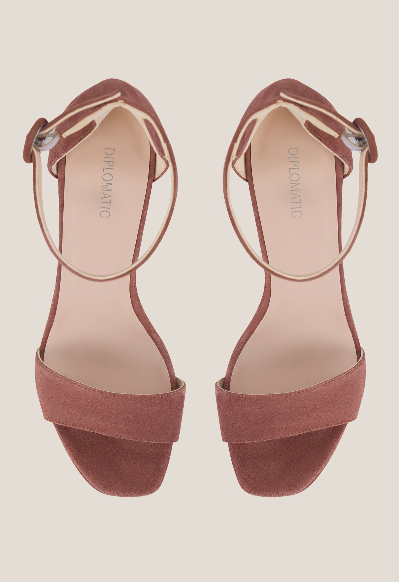 Persian pink suede heeled sandal with an open square toe. Adjustable ankle strap.
