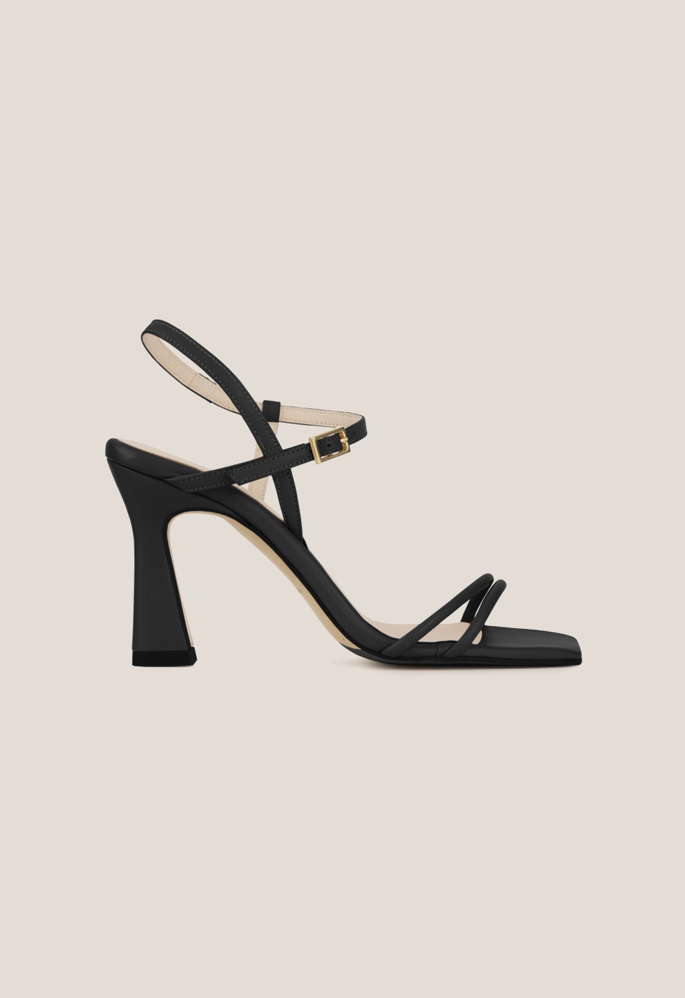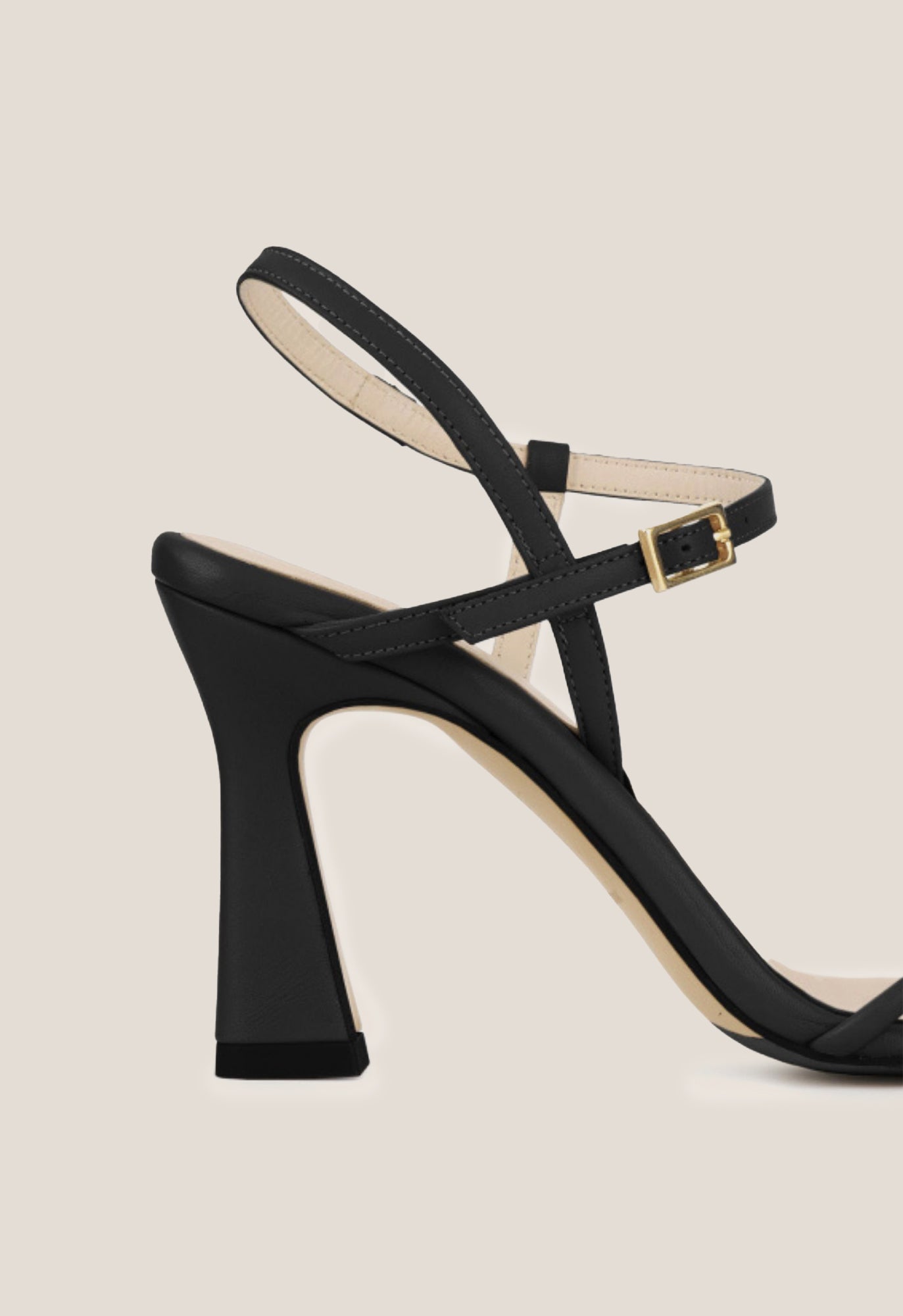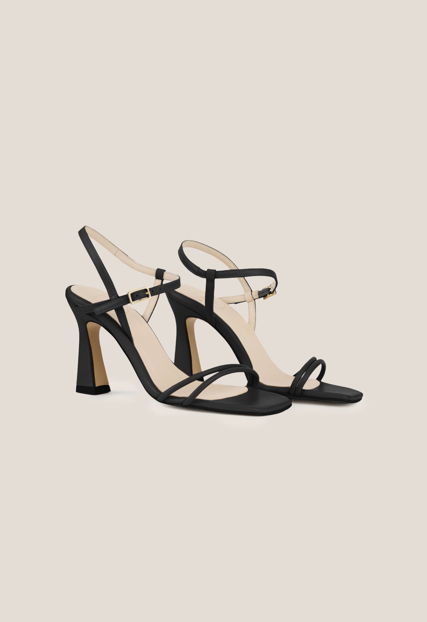 Black leather heeled sandal with front straps and an open square toe. A thin, adjustable ankle strap fastens at the ankle.