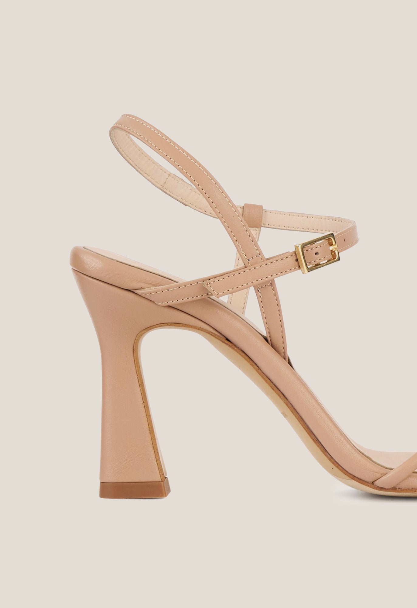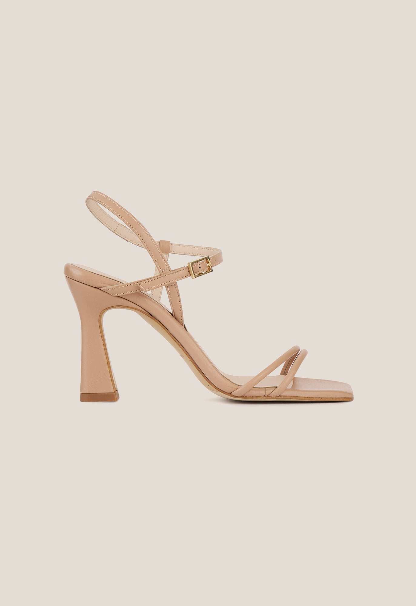 Nude leather heeled sandal with front straps and an open square toe. A thin, adjustable ankle strap fastens at the ankle.