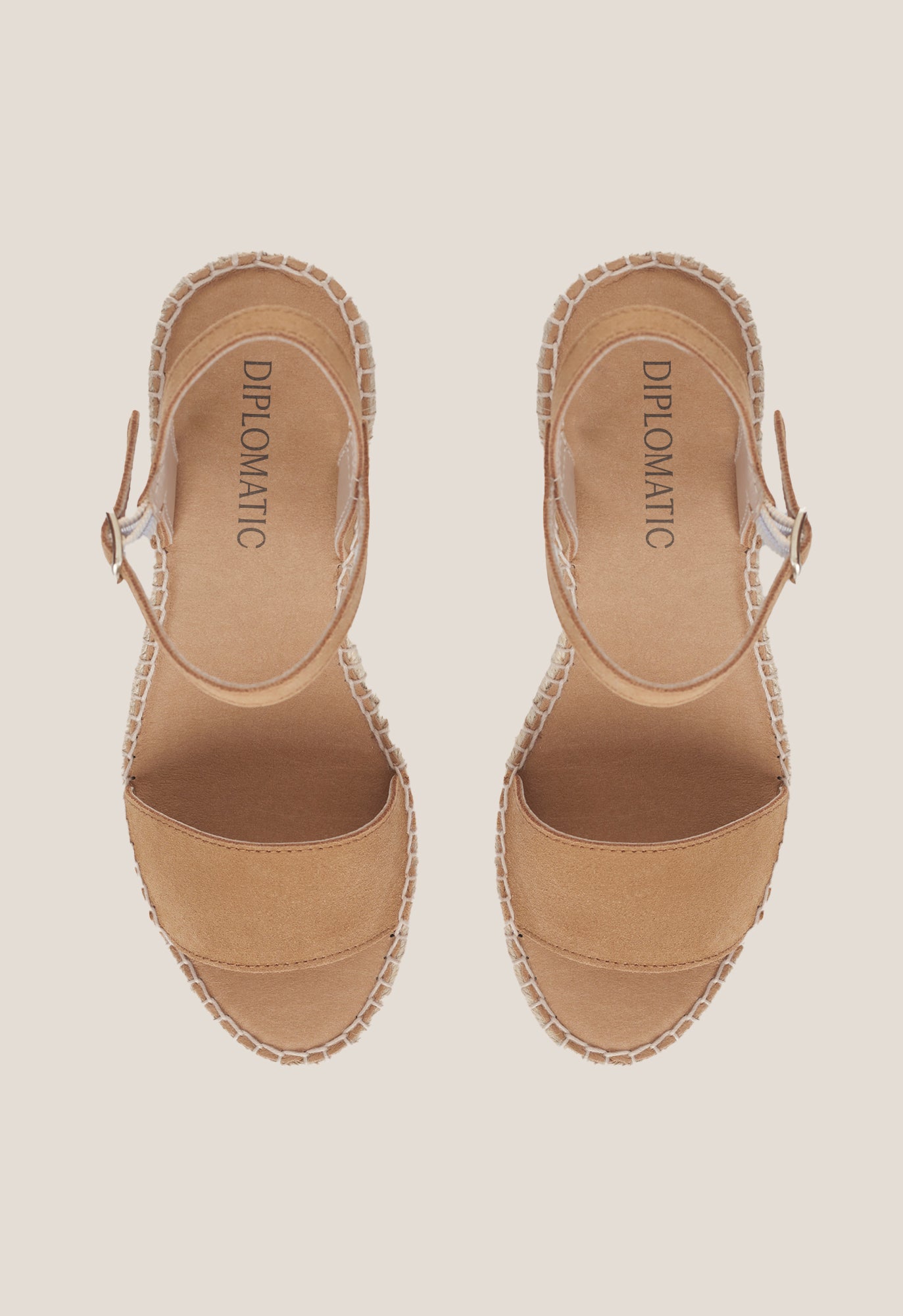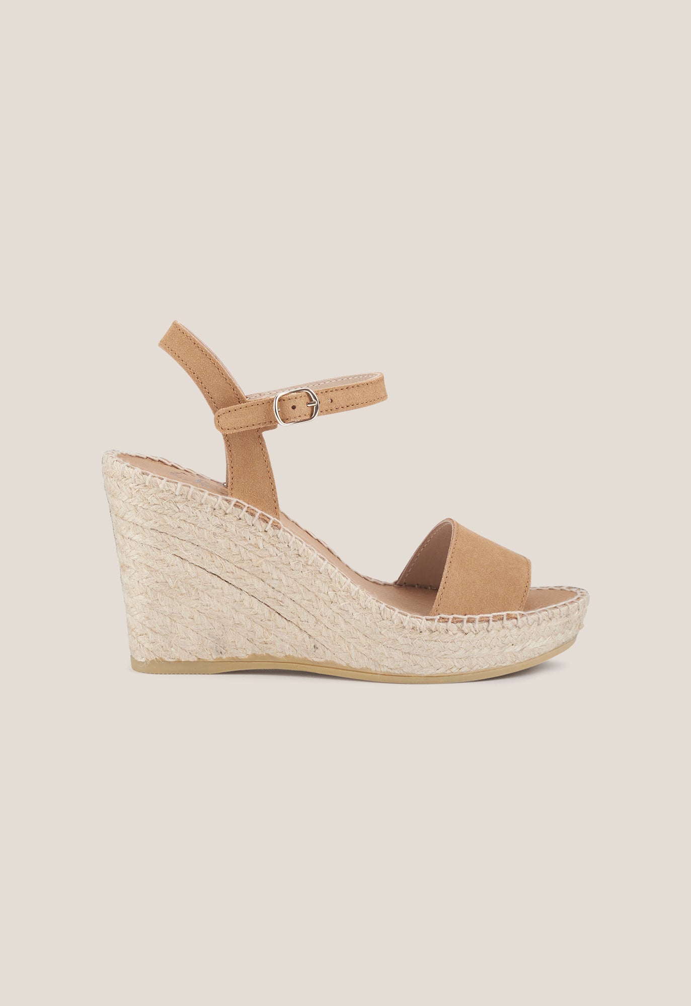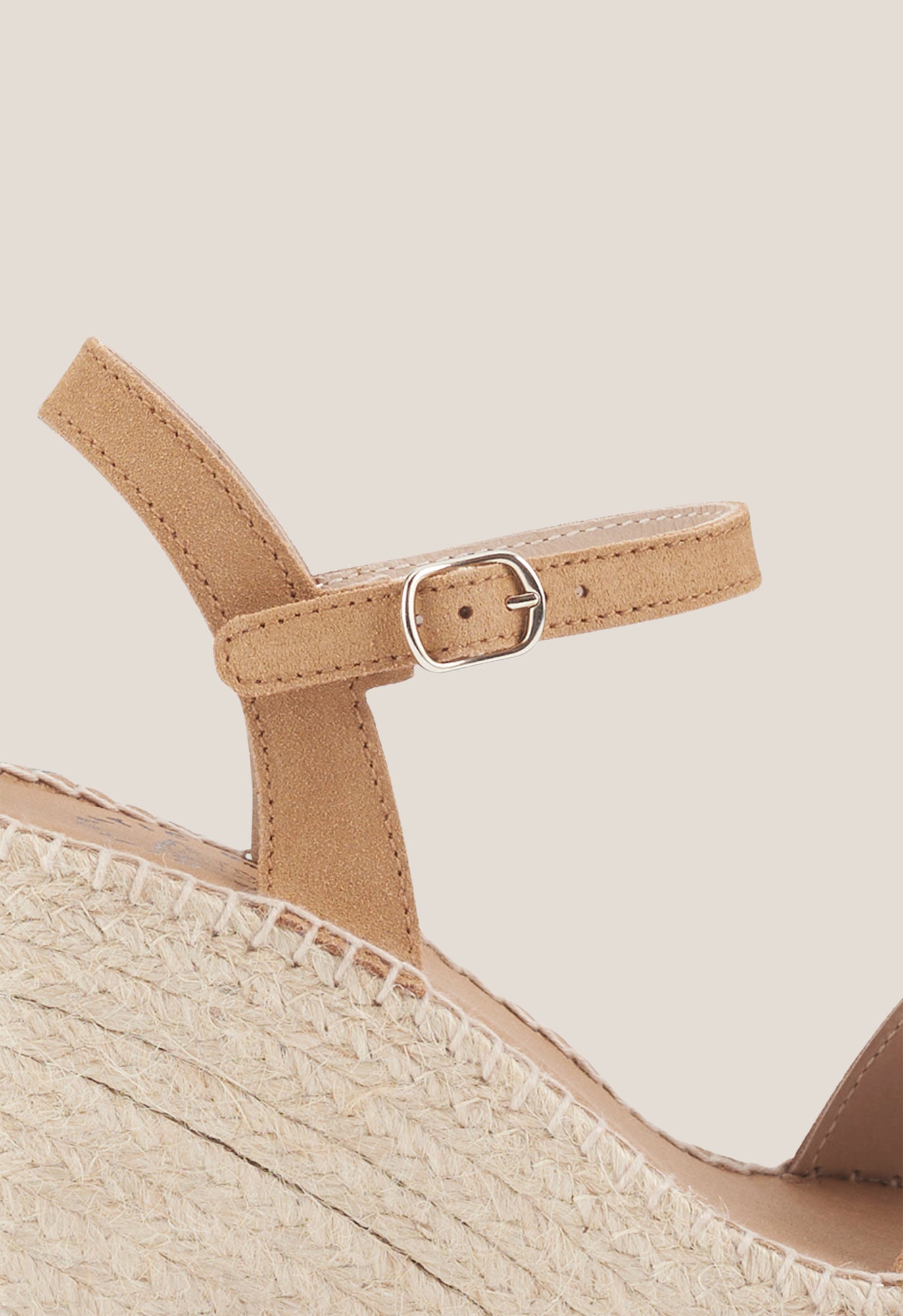 Wedge espadrille in leather-colored suede, with a strap across the instep and buckle closure at the ankle.