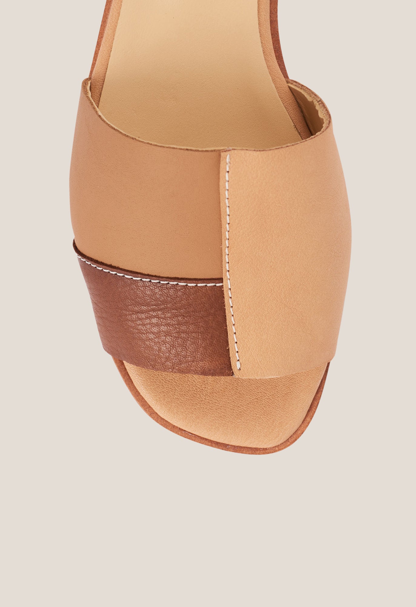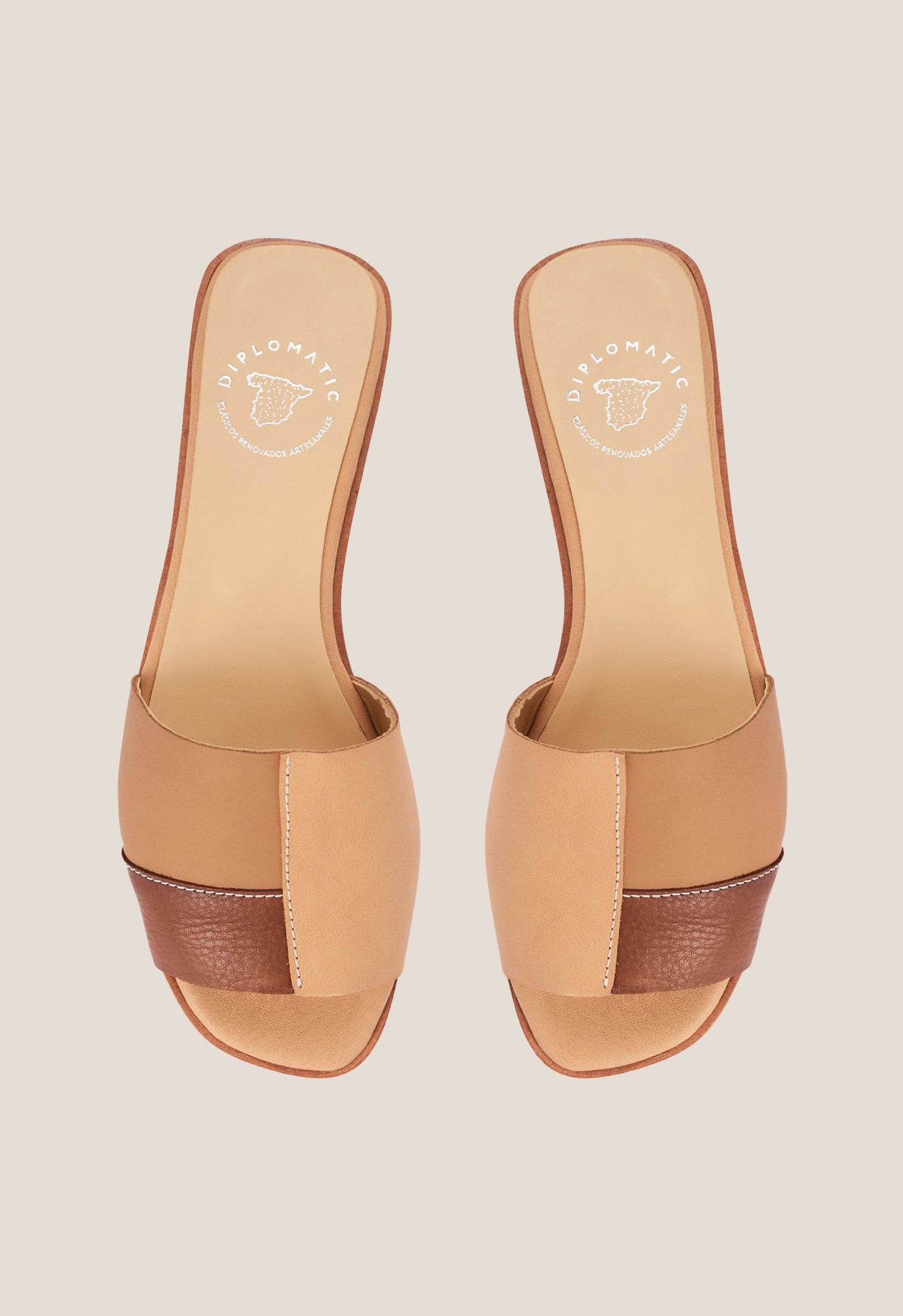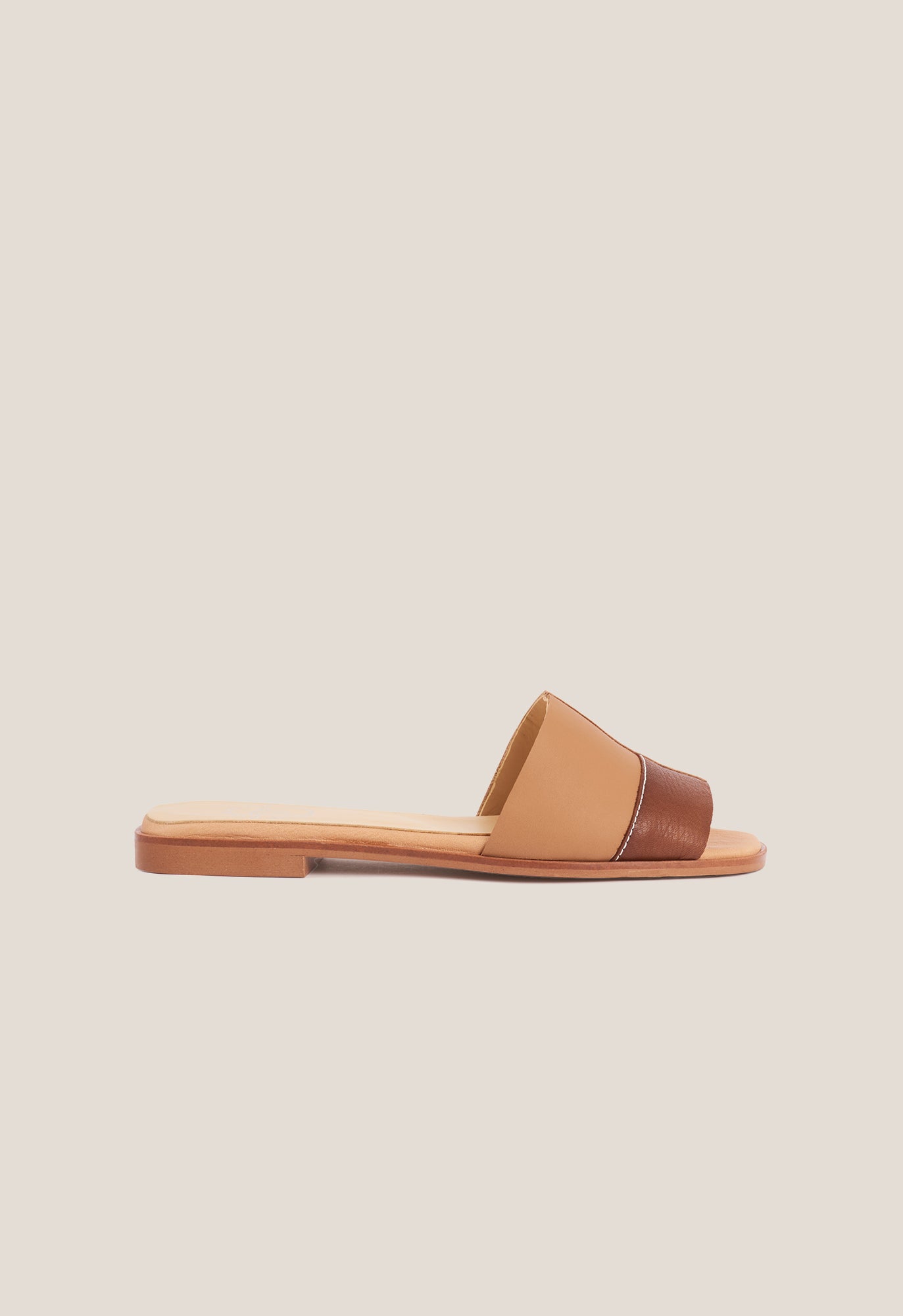 +34915369065Flat sandal with front strap in combined leather-colored calfskin.