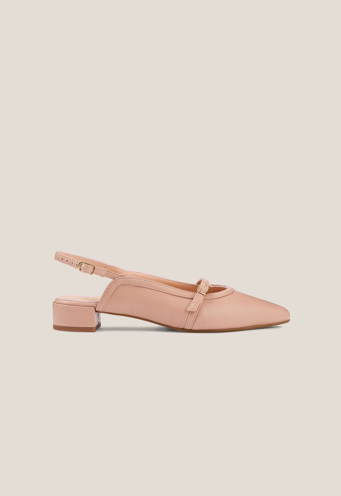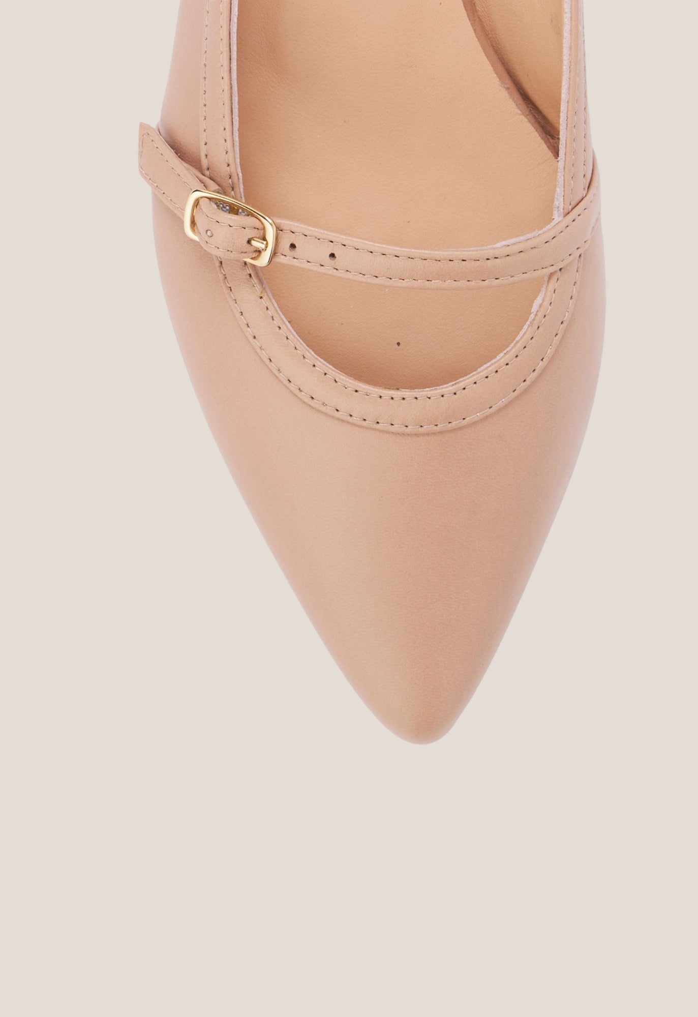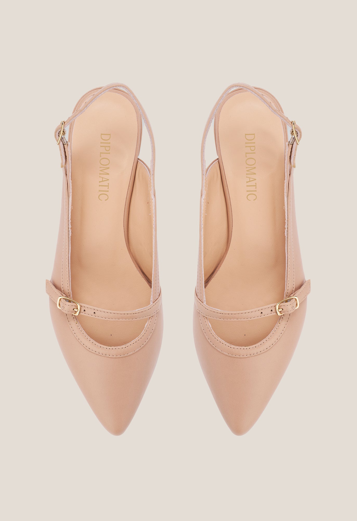 +34915369065Nude calfskin slingback ballerina flat with a gold-plated metal buckle . If you're unsure of a size, choose the smaller size .