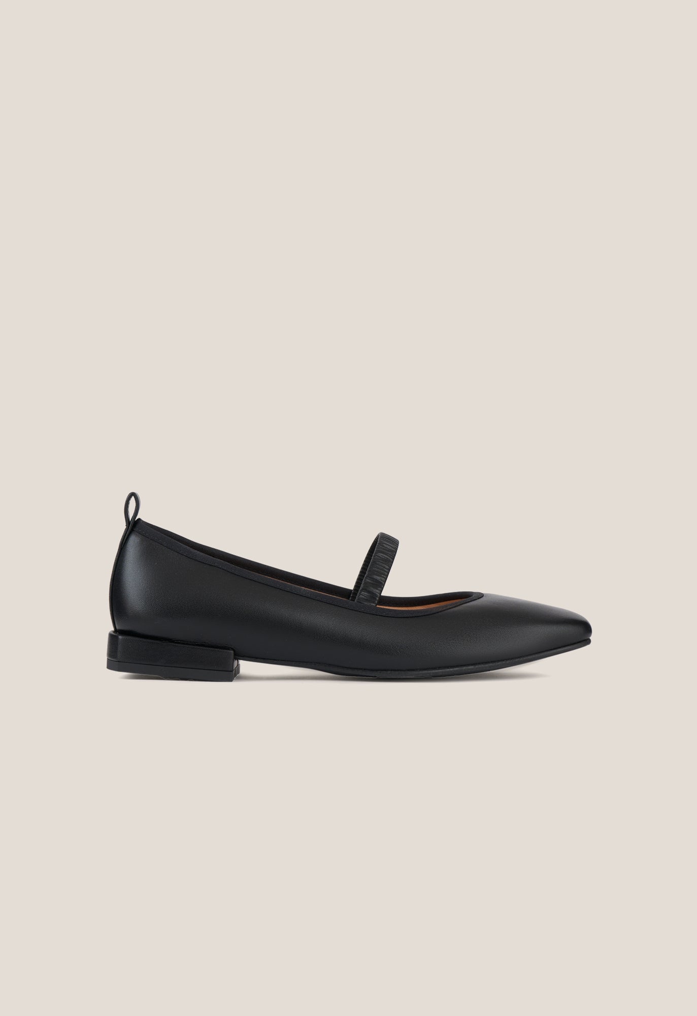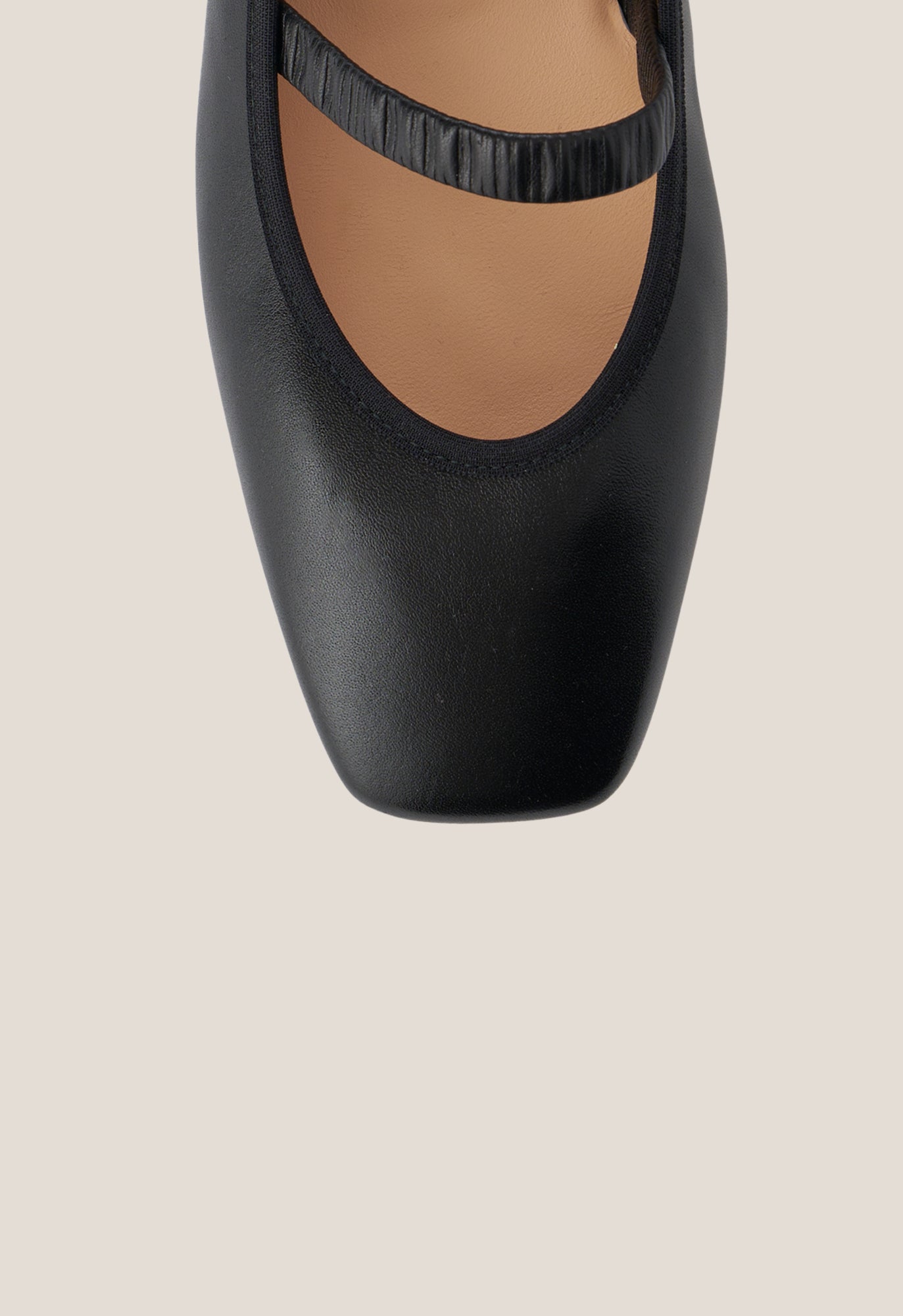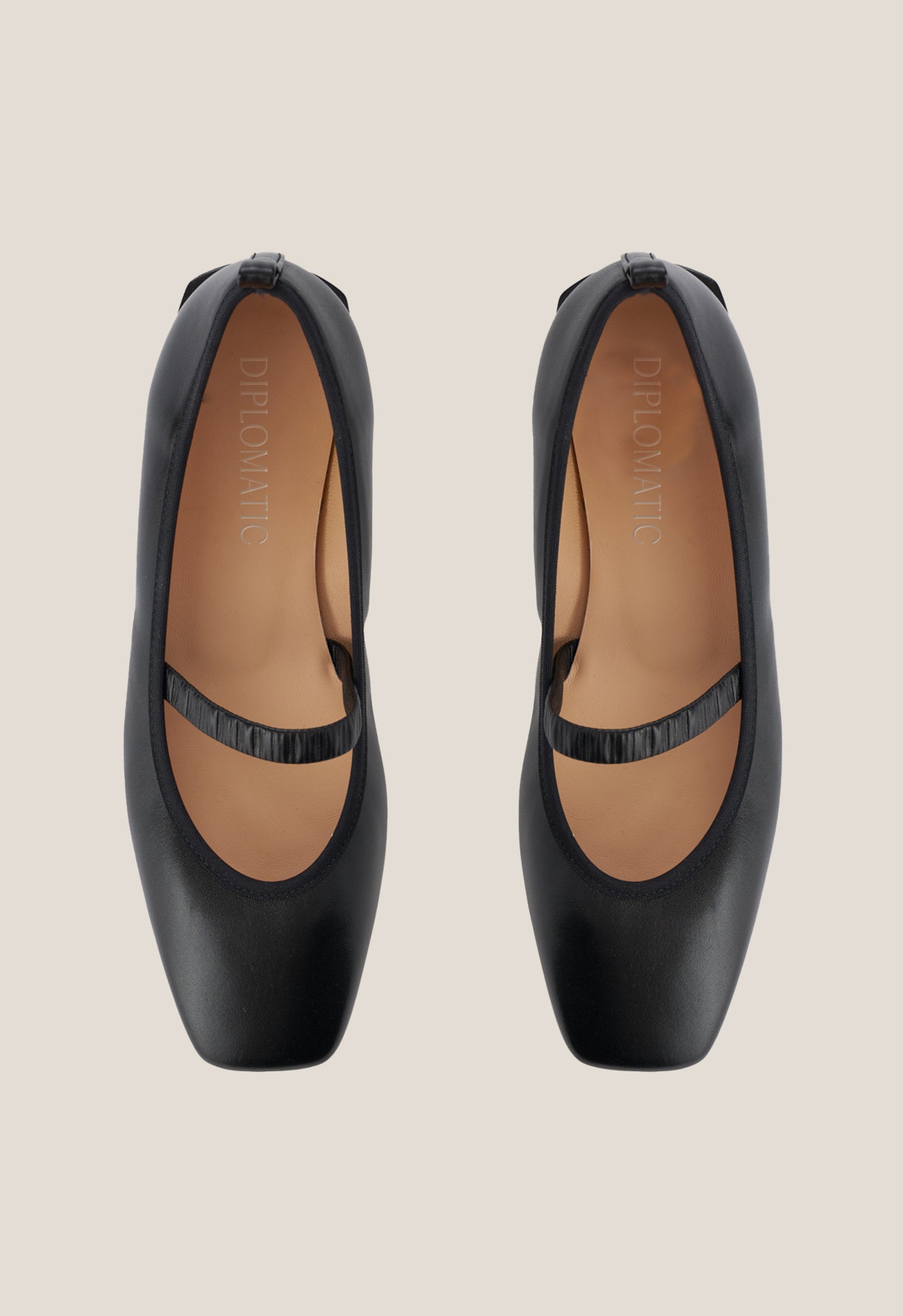 +34915369065 Black calfskin ballerina flat with elastic strap. Square toe and low heel.