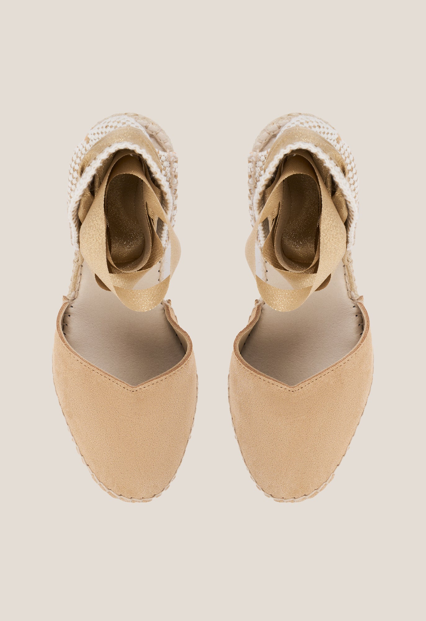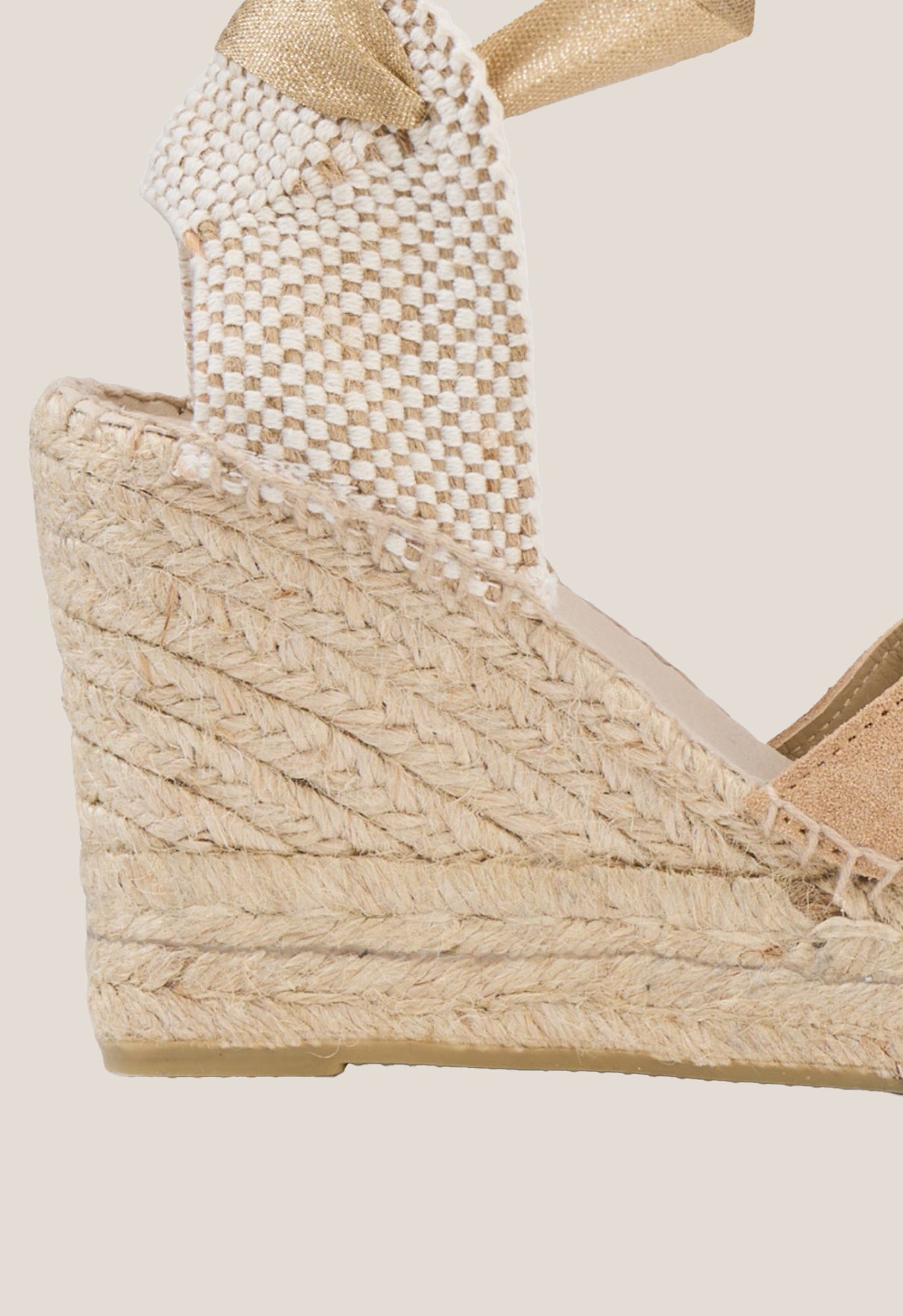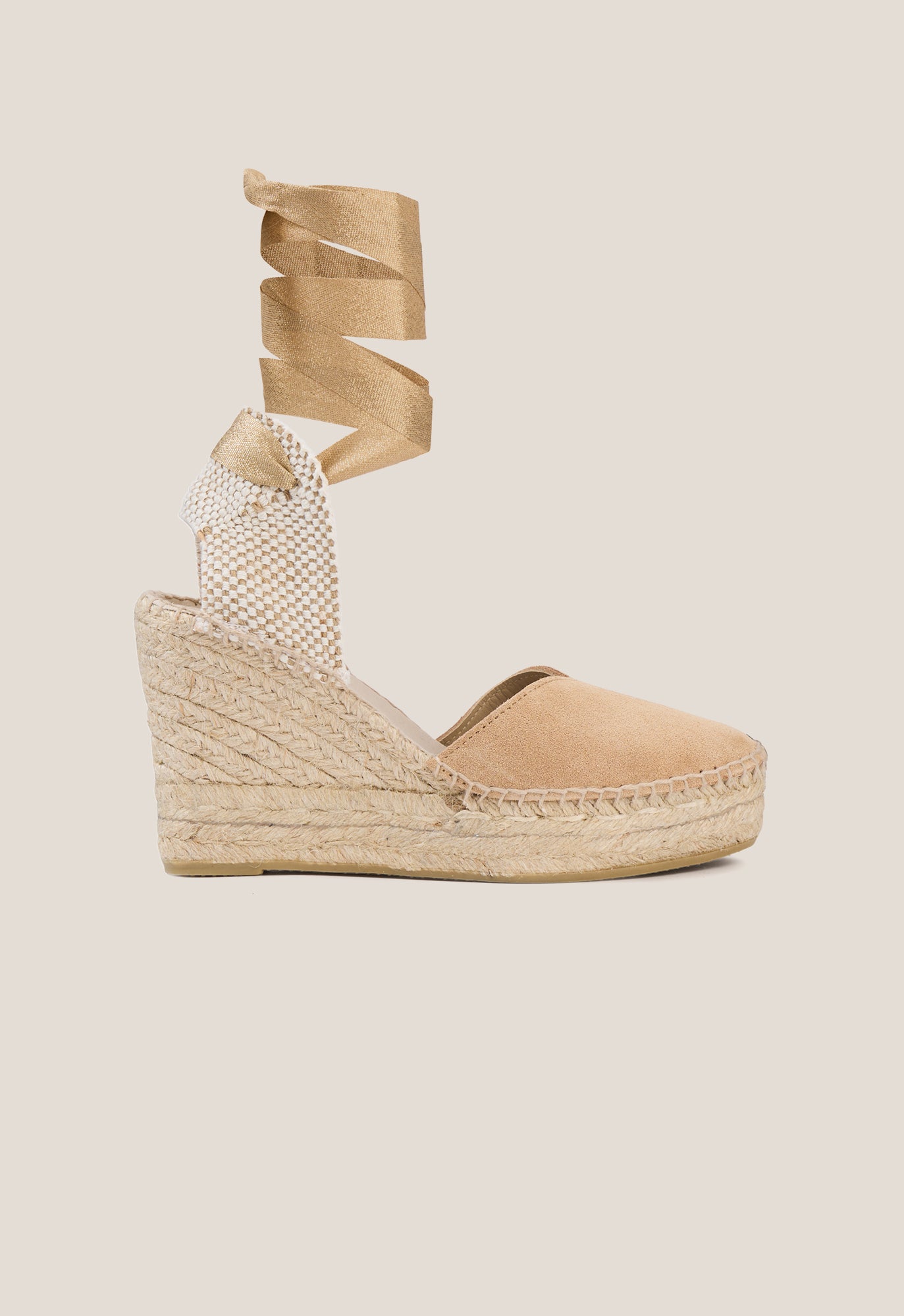 +34915369065Cappuccino suede wedge espadrille with a fabric back and cappuccino cotton strap closure. Round toe, 7.7 cm high at the highest point, and 2.5 cm platform.