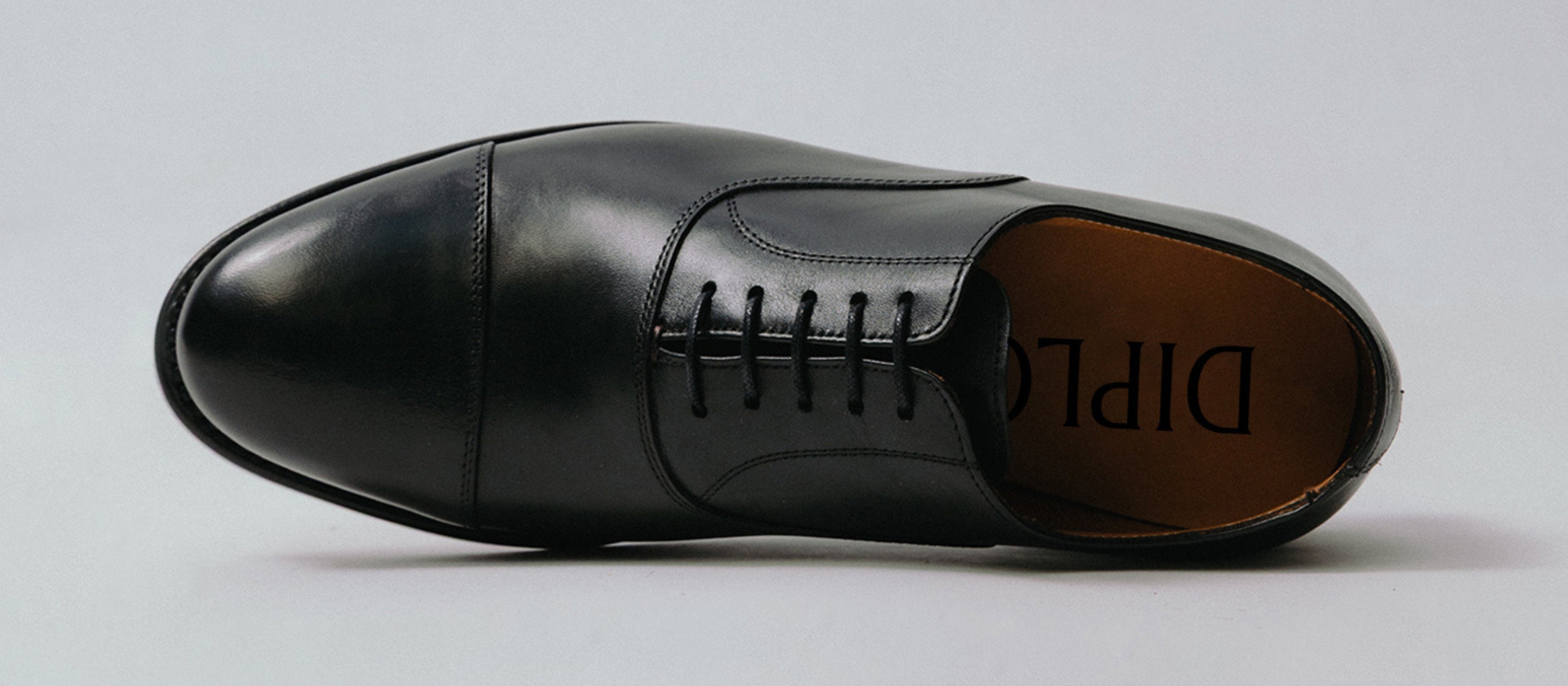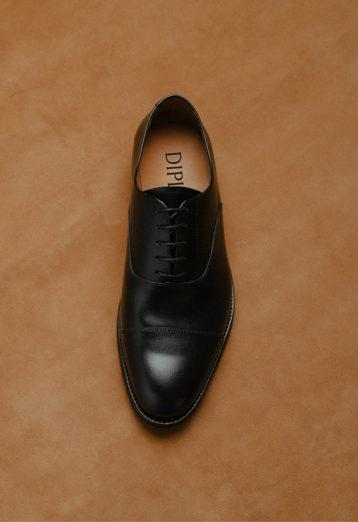 Zapato oxford de cordón con puntera partida en piel de becerro en color negro. Horma estructurada para calce idóneo.