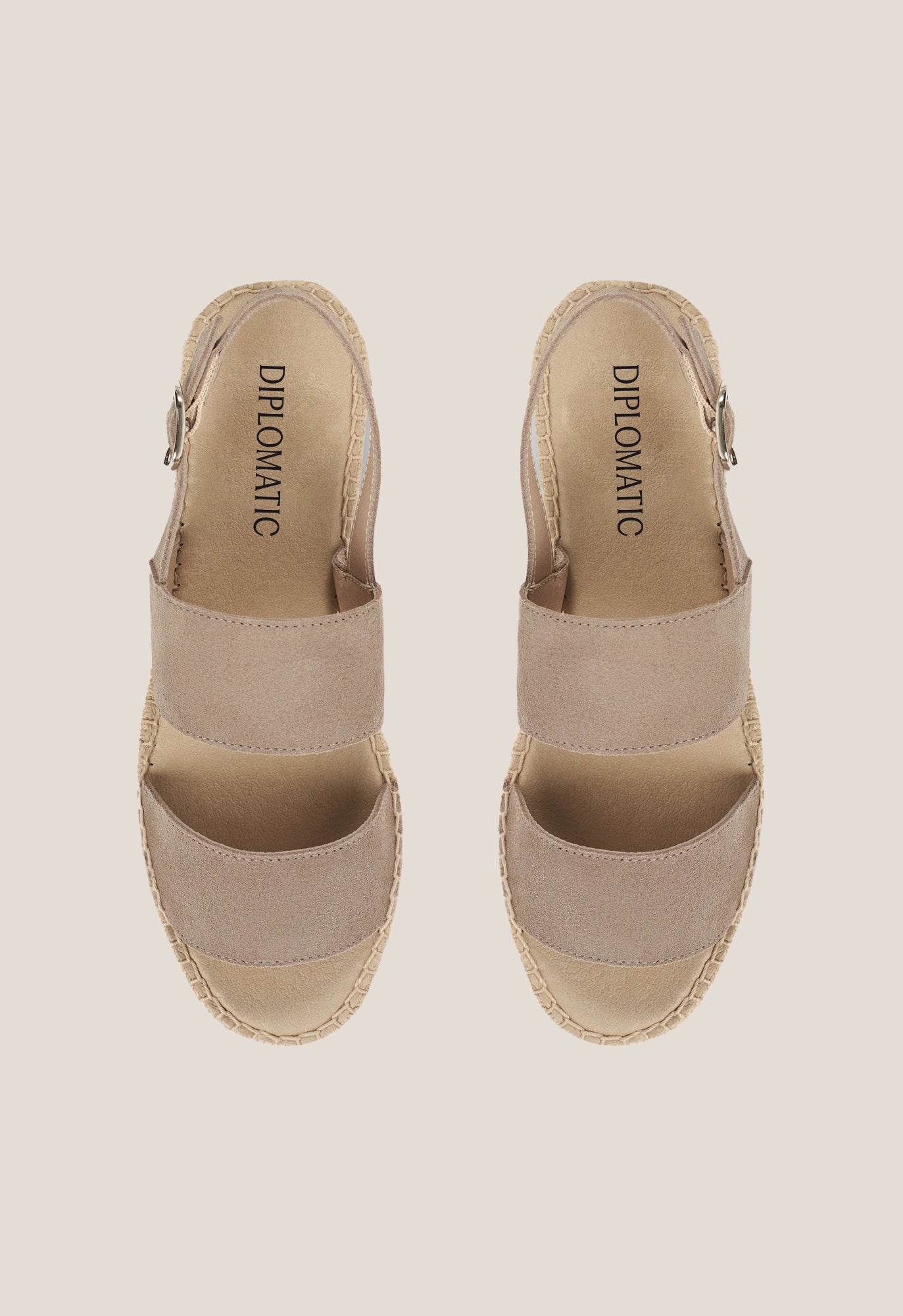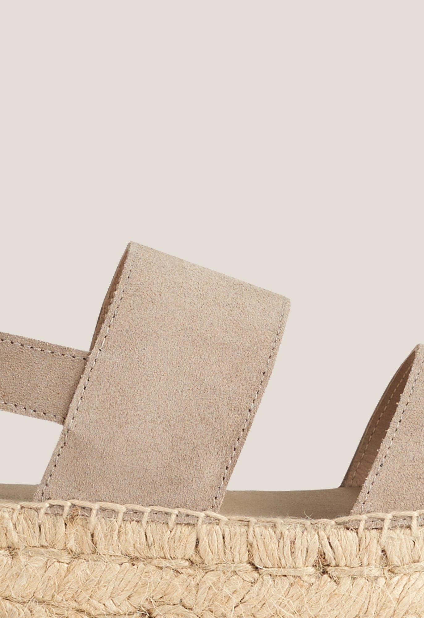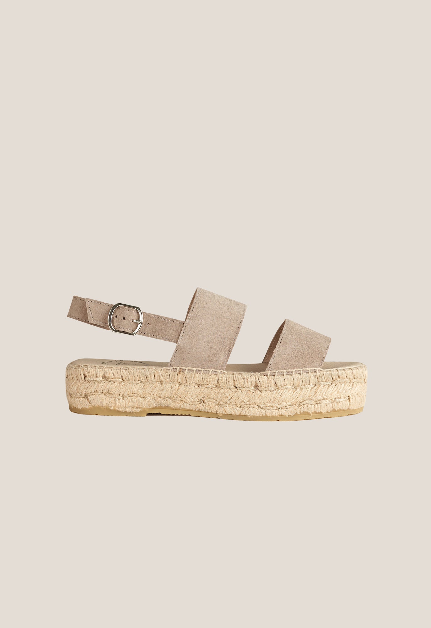Alpargata abierta en serraje de ante color caliza con dos tiras en el empeine y ajuste con hebilla en el tobillo.