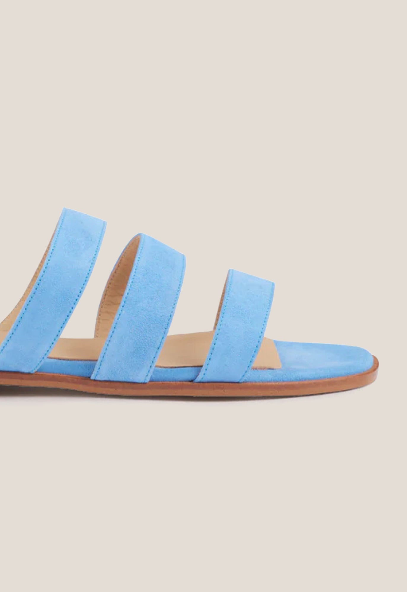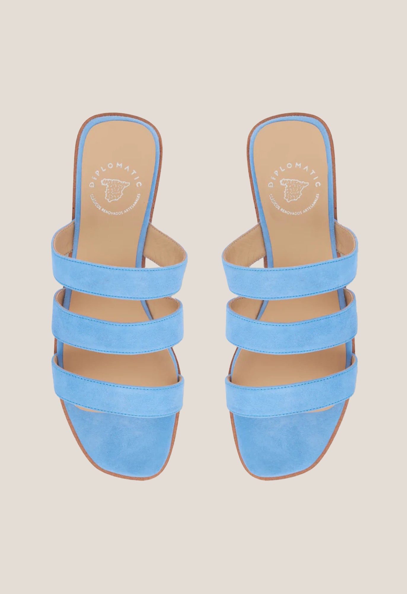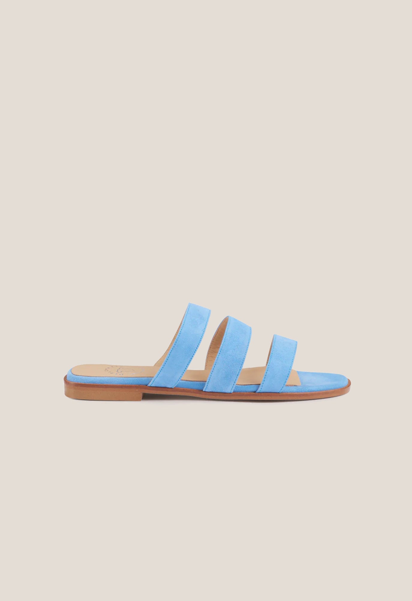 +34915369065Sandalia plana de tres tiras en ante color azul cielo.