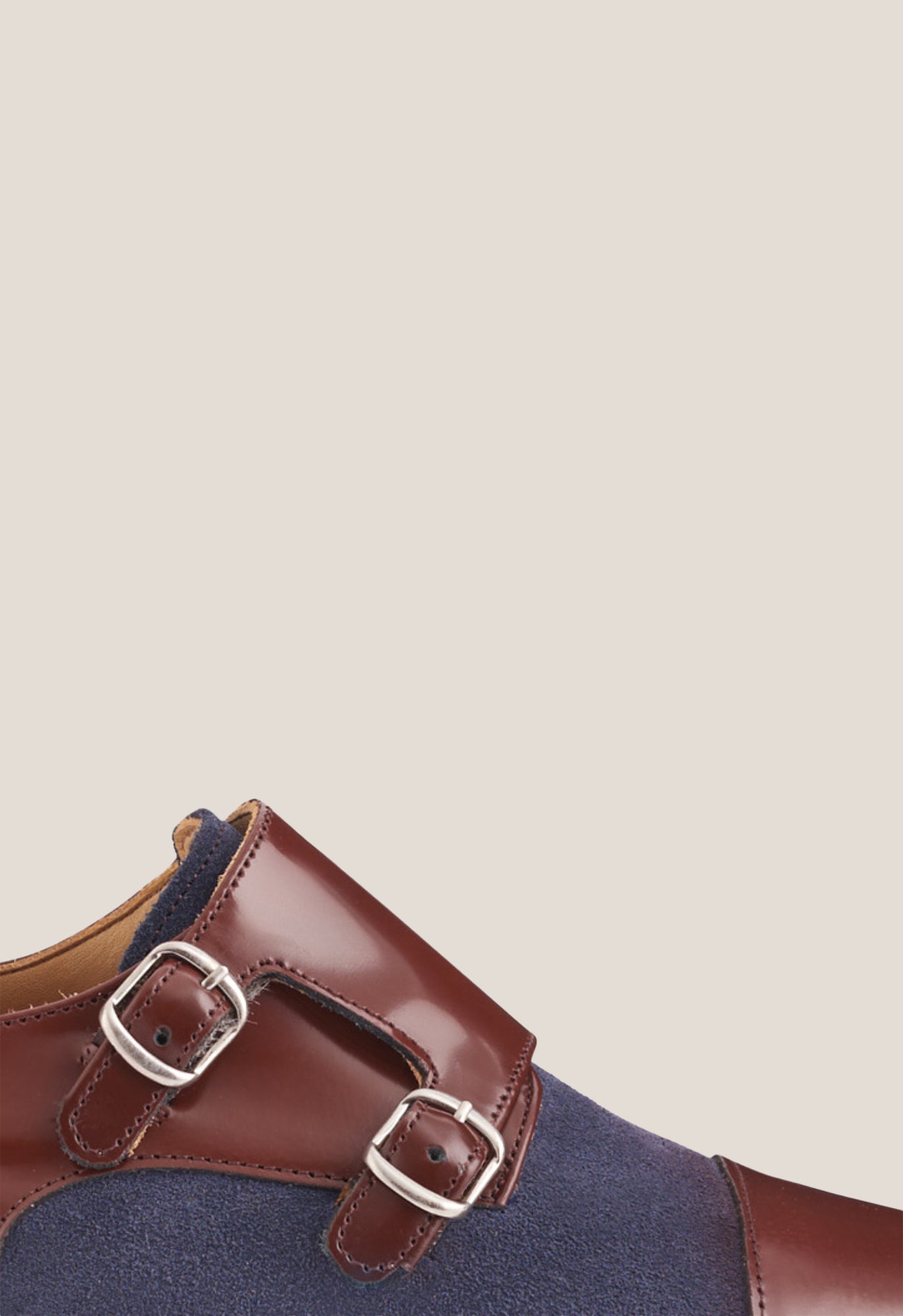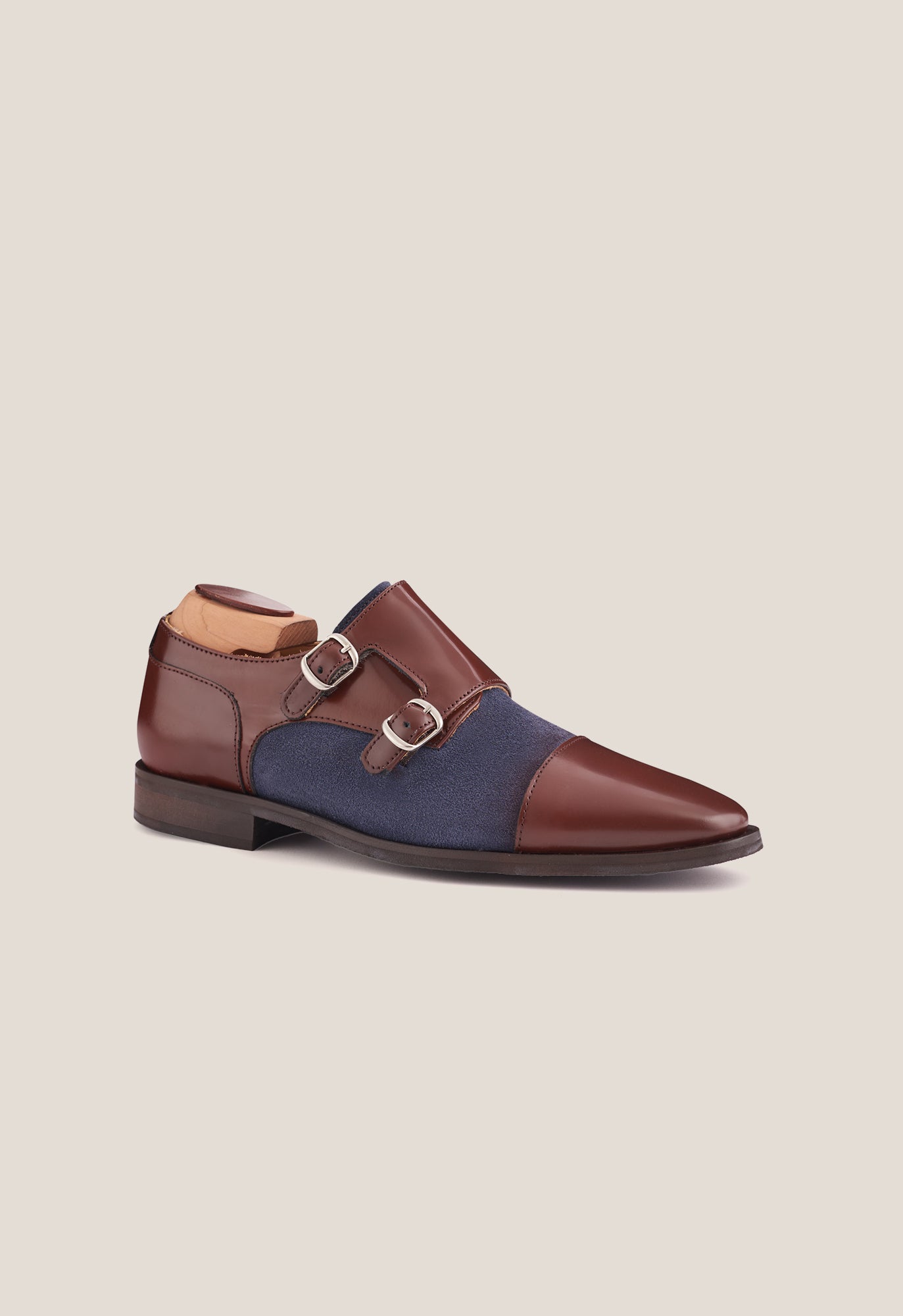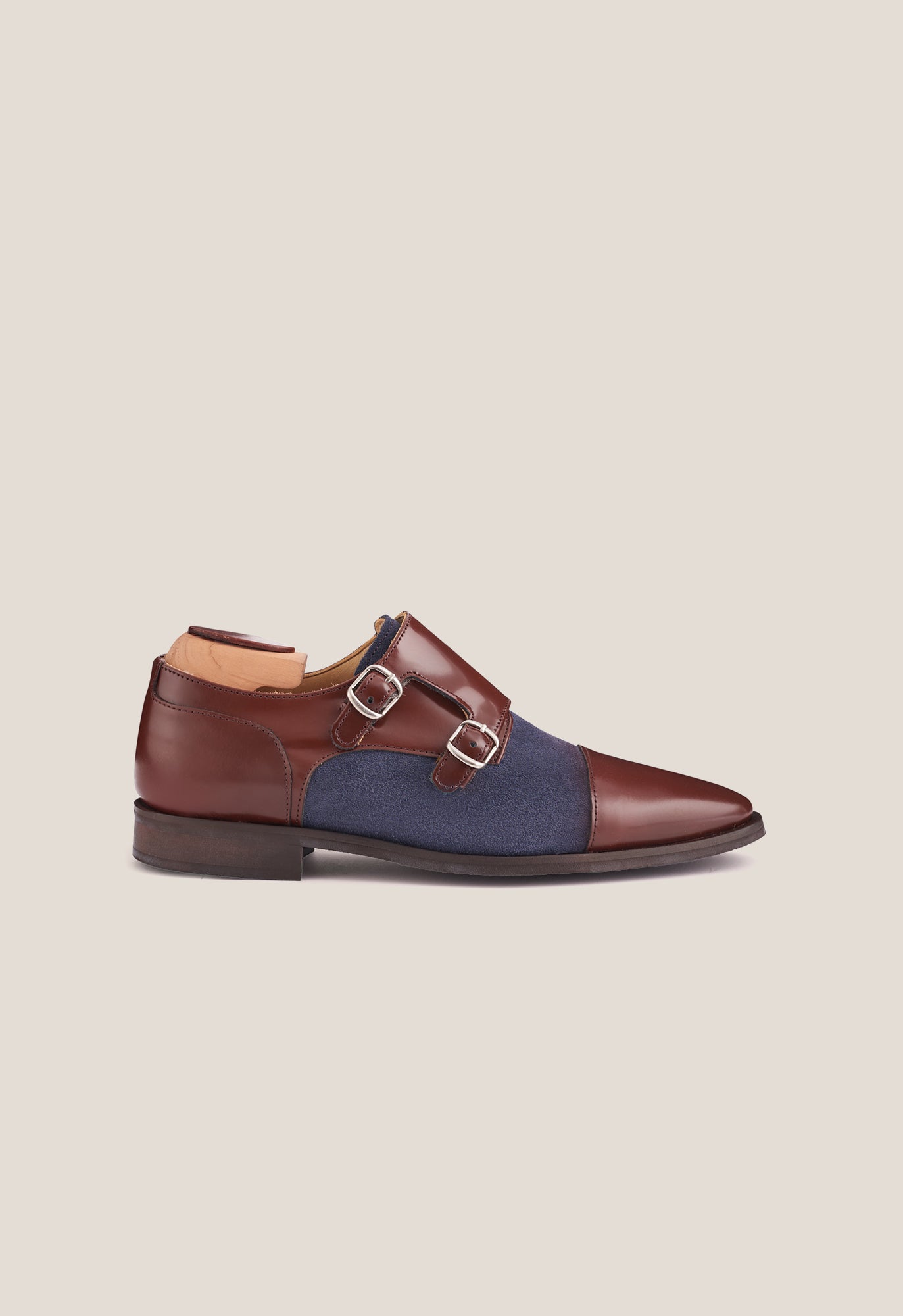 +34915369065Zapato de dos hebillas con puntera partida liso combinado en piel de becerro color toffe y ante color azul marino. Acabado con suela crepe antideslizante.